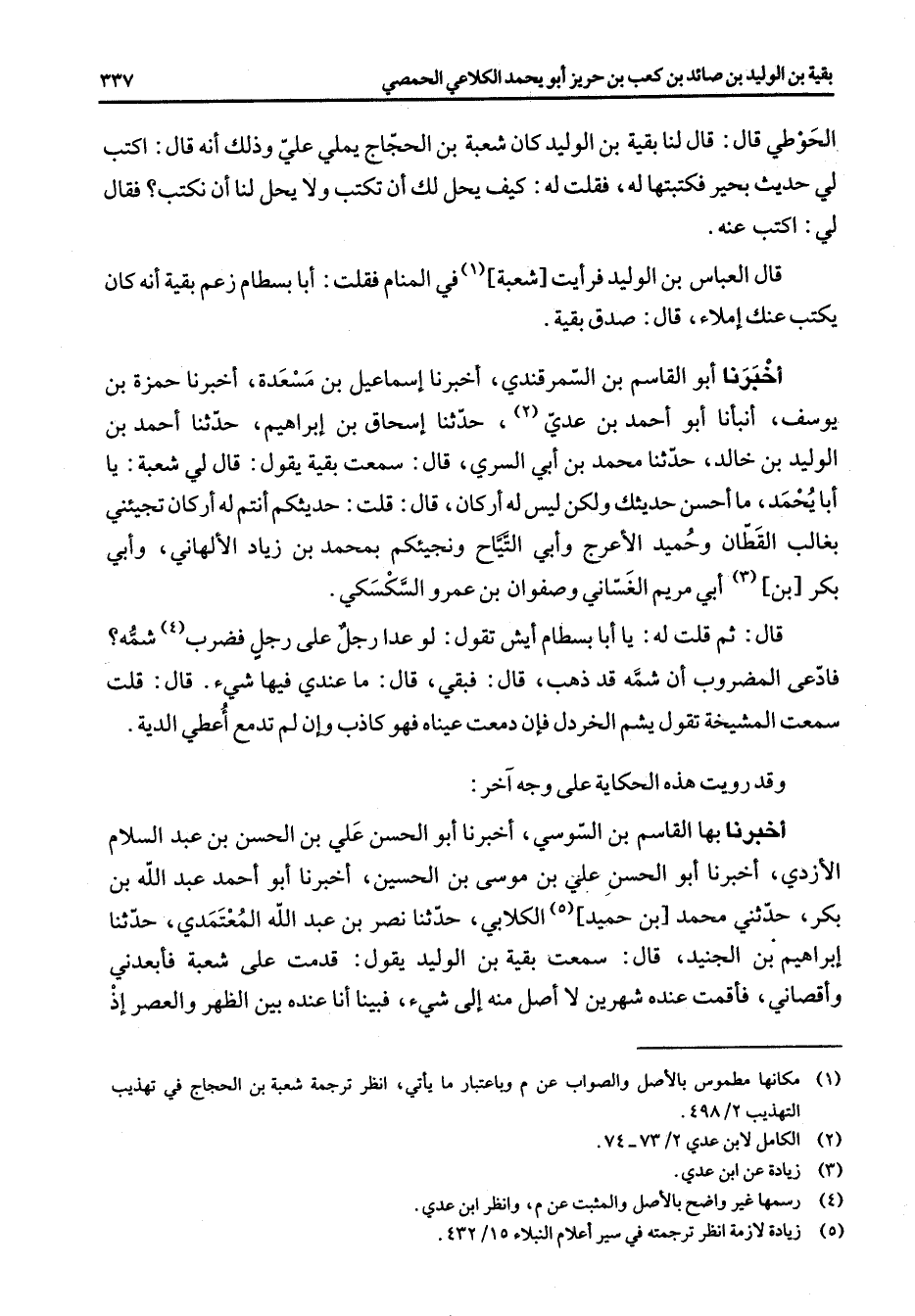 الحوطي قال قال لنا بقية بن الوليد كان شعبة بن الحجاج يملي علي وذلك أنه قال اكتب لي حديث بحير فكتبتها له فقلت له كيف يحل لك أن تكتب ولا يحل لنا أن نكتب فقال لي اكتب عنه قال العباس بن الوليد فرأيت شعبة (1) في المنام فقلت أبا بسطام زعم بقية أنه كان يكتب عنك إملاء قال صدق بقية أخبرنا أبو القاسم بن السمرقندي أخبرنا إسماعيل بن مسعدة أخبرنا حمزة بن يوسف أنبأنا أبو أحمد بن عدي (2) حدثنا إسحاق بن إبراهيم حدثنا أحمد بن الوليد بن خالد حدثنا محمد بن أبي السري قال سمعت بقية يقول قال لي شعبة يا أبا يحمد ما أحسن حديثك ولكن ليس له أركان قال قلت حديثكم أنتم له أركان تجيئني بغالب القطان وحميد الأعرج وأبي التياح ونجيئكم بمحمد بن زياد الألهاني وأبي بكر بن (3) أبي مريم الغساني وصفوان بن عمرو السكسكي قال ثم قلت يا أبا بسطام أيش تقول لو عدا رجل على رجل فضرب (4) شمه فادعى المضروب أن شمه قد ذهب قال فبقي قال ما عندي فيها شئ قال قلت سمعت المشيخة تقول يشم الخردل فإن دمعت عيناه فهو كاذب وإن لم تدمع أعطي الدية وقد رويت هذه الحكاية على وجه آخر أخبرنا بها القاسم بن السوسي أخبرنا أبو الحسن علي بن الحسن بن عبد السلام الأزدي أخبرنا أبو الحسن علي بن موسى بن الحسين أخبرنا أبو أحمد عبد الله بن بكر حدثني محمد بن حميد (5) الكلابي حدثنا نصر بن عبد الله المعتمدي حدثنا إبراهيم بن الجنيد قال سمعت بقية بن الوليد يقول قدمت على شعبة فأبعدني وأقصاني فأقمت عنده شهرين لا أصل منه إلا شئ فبينا أنا عنده بين الظهر والعصر إذ