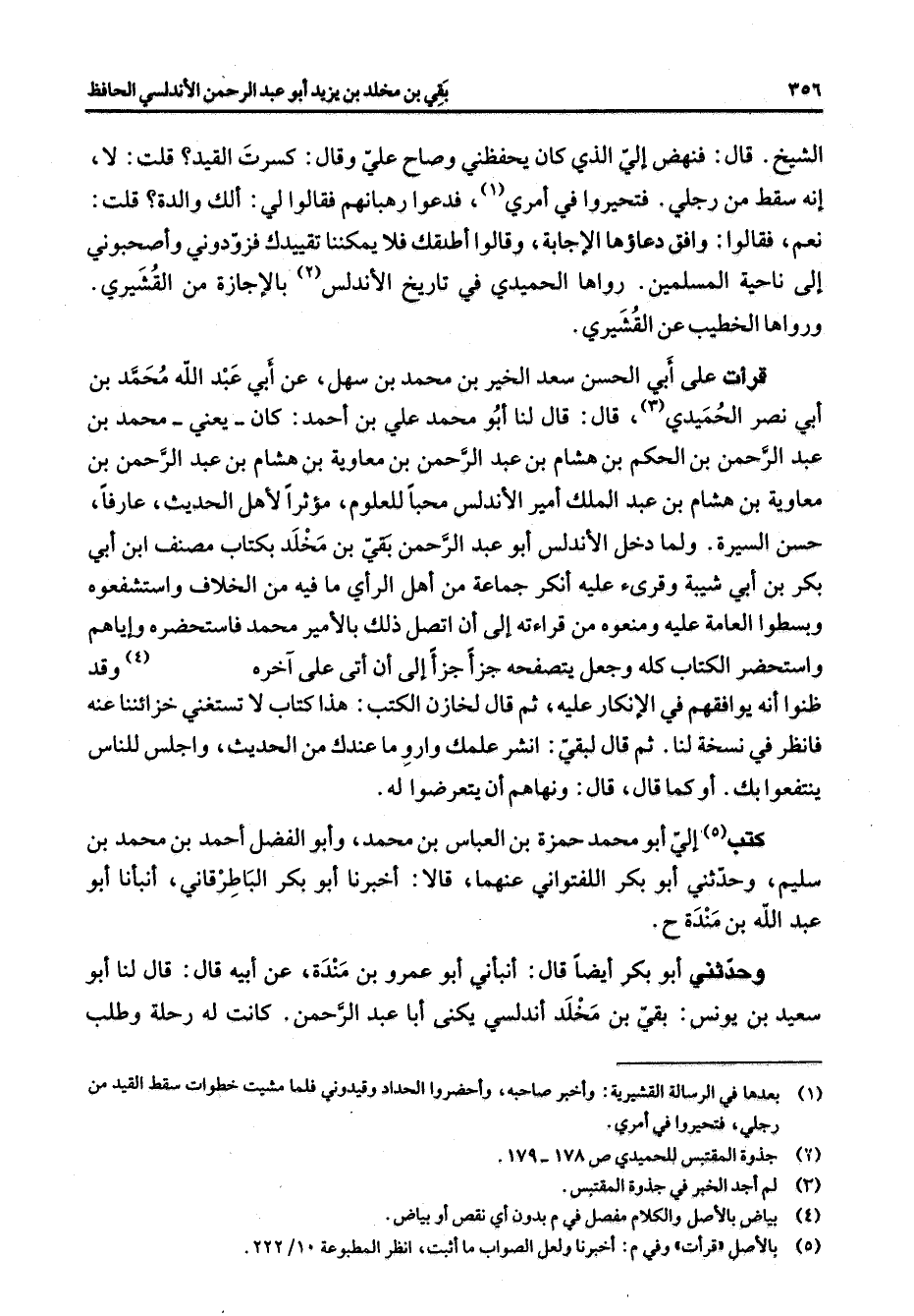 الشيخ قال فنهض إلى الذي كان يحفظني وصاح علي وقال كسرت القيد قلت لا إنه سقط من رجلي فتحيروا في أمري (1) فدعوا رهبانهم فقالوا لي ألك والدة قلت نعم فقالوا وافق دعاؤها الإجابة وقالوا أطلقك فلا يمكننا تقييدك فزودوني وأصحبوني إلى ناحية المسلمين رواها الحميدي في تاريخ الأندلس (2) بالإجازة من القشيري ورواها الخطيب عن القشيري قرأت على أبي الحسن سعد الخير بن محمد بن سهل عن أبي عبد الله محمد بن أبي نصر الحميدي (3) قال قال لنا أبو محمد علي بن أحمد كان يعني محمد بن عبد الرحمن بن الحكم بن هشام بن عبد الرحمن بن معاوية بن هشام بن عبد الرحمن بن معاوية بن هشام بن عبد الملك أمير الأندلس محبا للعلوم مؤثرا لأهل الحديث عارفا حسن السيرة ولما دخل الأندلس أبو عبد الرحمن بقي بن مخلد بكتاب مصنف ابن أبي بكر بن أبي شيبة وقرئ عليه أنكر جماعة من أهل الرأي ما فيه من الخلاف واستشفعوه وبسطوا العامة عليه ومنعوه من قراءته إلى أن اتصل ذلك بالأمير محمد فاستحضره وإياهم واستحضر الكتاب كله وجعل يتصفحه جزأ جزأ إلى أن أتى على آخره (4) وقد ظنوا أنه يوافقهم في الإنكار عليه ثم قال لخازن الكتب هذا كتاب لا تستغني خزائننا عنه فانظر في نسخة لنا ثم قال لبقي انشر علمك وارو ما عندك من الحديث واجلس للناس ينتفعوا بك أو كما قال قال ونهاهم أن يتعرضوا له كتب (5) إلي أبو محمد حمزة بن العباس بن محمد وأبو الفضل أحمد بن محمد بن سليم وحدثني أبو بكر اللفتواني عنهما قالا أخبرنا أبو بكر الباطرقاني أنبأنا أبو عبد الله بن مندة ح وحدثني أبو بكر أيضا قال أنبأني أبو عمرو بن مندة عن أبيه قال قال لنا أبو سعيد بن يونس بقي بن مخلد أندلسي يكنى أبا عبد الرحمن كانت له رحلة وطلب