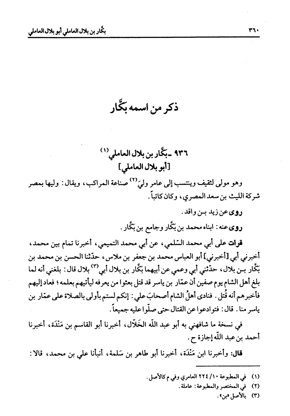 936 - بكار بن بلال العاملي (1) أبو بلال العاملي وهو مولى لثقيف وينتسب إلى عامر ولي (2) صناعة المراكب ويقال وليها بمصر شركة الليث بن سعد المصري وكان كاتبا روى عن زيد بن واقد روى عنه ابناه محمد بن بكار وجامع بن بكار قرأت على أبي محمد السلمي عن أبي محمد التميمي أخبرنا تمام بين محمد أخبرني أبي أخبرني أبو العباس محمد بن جعفر بن ملاس حدثنا الحسن بن محمد بن بكار بن بلال حدثني أبي وعمي عن أبيهما بكار بن بلال أبي (3) بلال قال بلغني أنه لما بلغ أهل الشام يوم صفين أن عمار بن ياسر قد قتل بعثوا من يعرفه ليأتيهم بعلمه فعاد إليهم فأخبرهم أنه قتل فنادى أهل الشام أصحاب علي إنكم لستم بأولي بالصلاة على عمار بن ياسر منا قال فتوادعوا عن القتال حتى صلوا عليه جميعا في نسخة ما شافهني به أبو عبد الله الخلال أخبرنا أبو القاسم بن مندة أخبرنا أحمد بن عبد الله إجازة ح قال وأخبرنا ابن مندة أخبرنا أبو طاهر بن سلمة أنبأنا علي بن محمد قالا