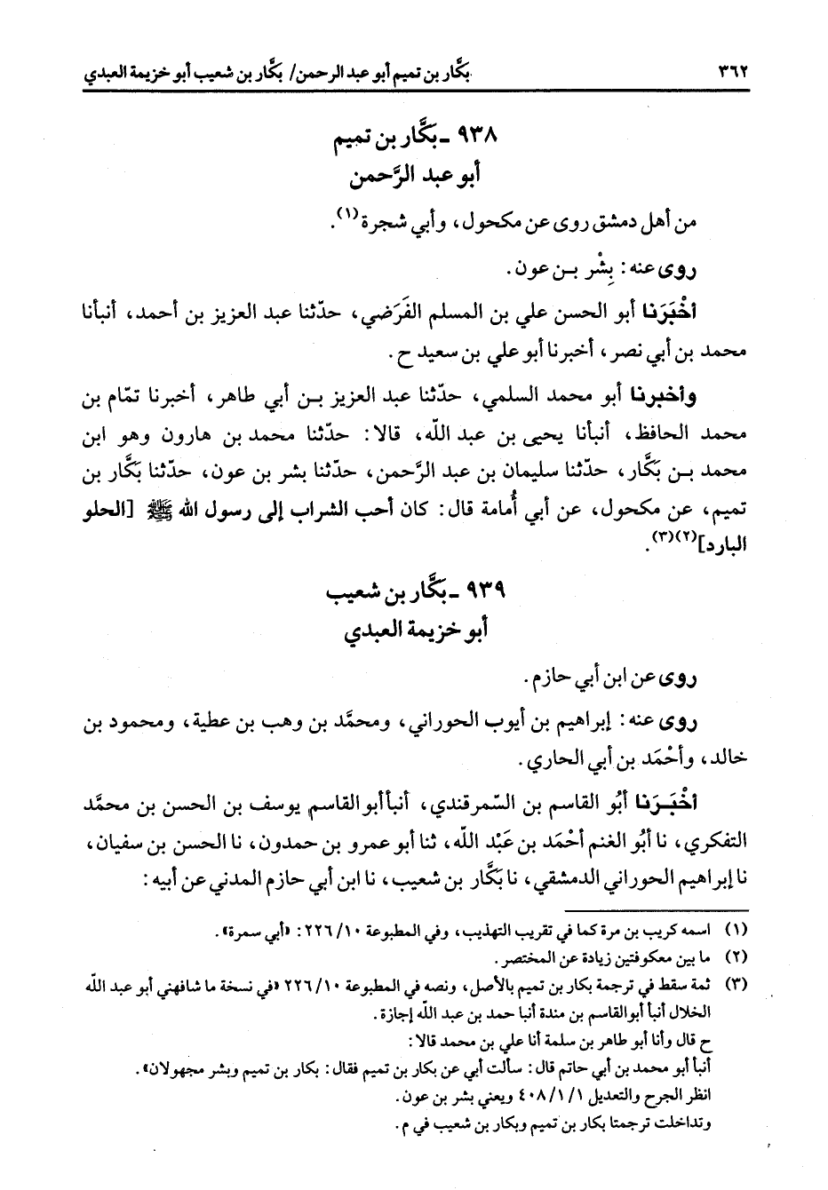 938 - بكار بن تميم أبو عبد الرحمن من أهل دمشق روى عن مكحول وأبي شجرة (1) روى عنه بشر بن عون أخبرنا أبو الحسن علي بن المسلم الفرضي حدثنا عبد العزيز بن احمد أنبأنا محمد بن أبي نصر أخبرنا أبو علي بن سعيد ح وأخبرنا أبو محمد السلمي حدثنا عبد العزيز بن أبي طاهر أخبرنا تمام بن محمد الحافظ أنبأنا يحيى بن عبد الله قالا حدثنا محمد بن هارون وهو ابن محمد بن بكار حدثنا سليمان بن عبد الرحمن حدثنا بشر بن عون حدثنا بكار بن تميم عن مكحول عن أبي أمامة قال كان أحب الشراب إلى رسول الله (صلى الله عليه وسلم) الحلو البارد (2) (3)