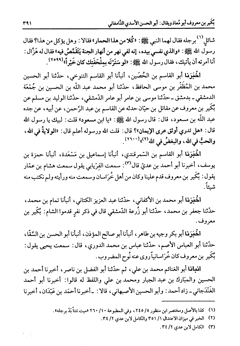 [2599] أخبرنا أبو القاسم بن الحصين أنبأنا أبو القاسم التنوخي حدثنا أبو الحسين محمد بن المظفر بن موسى الحافظ حدثنا أبو محمد عبد الله بن الحسين بن جمعة الدمشقي بدمشق حدثنا موسى بن عامر أبو عامر الدمشقي حدثنا الوليد بن مسلم عن بكير بن معروف عن مقاتل بن حيان حدثه عن القاسم بن عبد الرحمن عن أبيه عن جده عبد الله بن مسعود قال قال رسول الله (صلى الله عليه وسلم) يا ابن مسعود قلت لبيك يا رسول الله قال هل تدري أوثق عرى الإيمان قال قلت الله ورسوله أعلم قال الولاية في الله والحب في الله والبغض في الله (2)