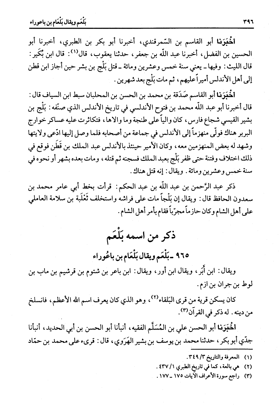 965 - بلعم ويقال بلعام بن باعوراء ويقال ابن أبر ويقال ابن أور ويقال ابن باعر بن شتوم بن قرشيم بن ماب بن لوط بن جران بن ازم كان يسكن قرية من قرى البلقاء (2) وهو الذي كان يعرف اسم الله الأعظم فانسلخ من دينه له ذكر في القرآن (3) أخبرنا أبو الحسن علي بن المسلم الفقيه أنبأنا أبو الحسن بن أبي الحديث أنبأنا جدي أبو بكر حدثنا محمد بن يوسف بن بشير الهروي قال قرئ على محمد بن حماد