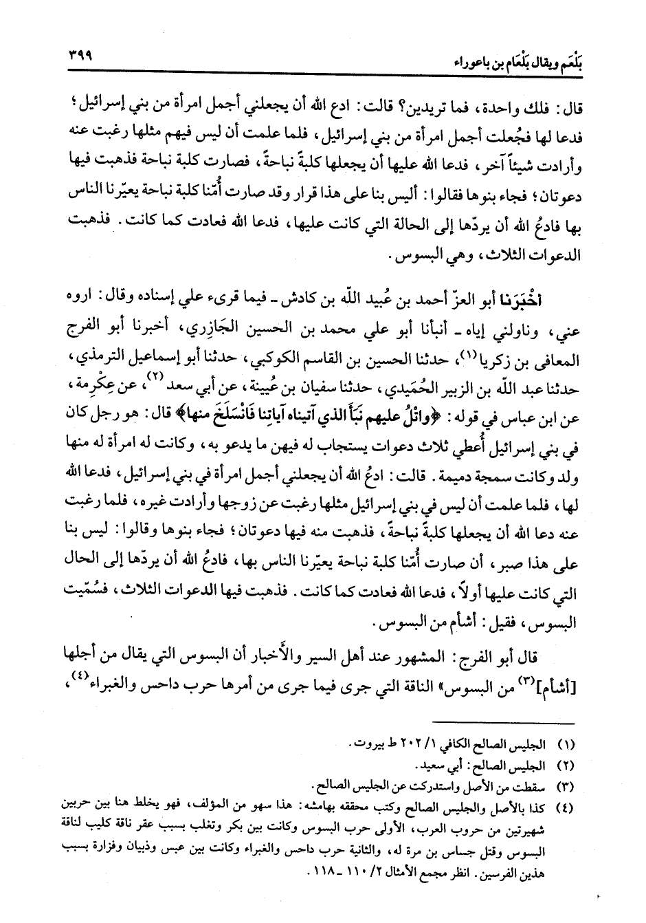 قال فلك واحدة فما تريدين قالت ادع الله أن يجعلني أجمل امرأة من بني إسرائيل فدعا لها فجعلت أجمل امرأة من بني إسرائيل فلما علمت أن ليس فيهم مثلها رغبت عنه وأرادت شيئا آخر فدعا الله عليها أن يجعلها كلبة نباحة فصارت كلبة نباحة فذهبت فيها دعوتان فجاء بنوها فقالوا أليس بنا على هذا قرار وقد صارت أمنا كلبة نباحة يعيرنا الناس بها فادع الله أن يردها إلى الحالة التي كانت عليها فدعا الله فعادت كما كانت فذهبت الدعوات الثلاث وهي البسوس " أخبرنا أبو العز أحمد بن عبيد الله بن كادش فيما قرئ علي إسناده وقال اروه عني وناولني إياه أنبأنا أبو علي محمد بن الحسين الجازري أخبرنا أبو الفرج المعافى بن زكريا (1) حدثنا الحسين بن القاسم الكوكبي حدثنا أبو إسماعيل الترمذي حدثنا عبد الله بن الزبير الحميدي حدثنا سفيان بن عيينة عن أبي سعد (2) عن عكرمة عن ابن عباس في قوله (واتل عليهم نبأ الذي آتيناه آياتنا فانسلخ منها) قال هو رجل كان في بني إسرائيل أعطي ثلاث دعوات يستجاب له فيهن ما يدعو به وكانت له امرأة له منها ولد وكانت سمجة دميمة قالت ادع الله أن يجعلني أجمل امرأة في بني إسرائيل فدعا الله لها فلما علمت أن ليس في بني إسرائيل مثلها رغبت عن زوجها وأرادت غيره فلما رغبت عنه دعا الله أن يجعلها كلبة نباحة فذهبت منه فيها دعوتان فجاء بنوها وقالوا ليس بنا على هذا صبر أن صارت أمنا كلبة نباحة يعيرنا الناس بها فادع الله أن يردها إلى الحال التي كانت عليها أولا فدعا الله فعادت كما كانت فذهبت فيها الدعوات الثلاث فسميت البسوس فقيل أشأم من البسوس قال أبو الفرج المشهور عند أهل السير والأخبار أن البسوس التي يقال من أجلها أشأم (3) من البسوس الناقة التي جرى فيما جرى من أمرها حرب داحس والغبراء (4)