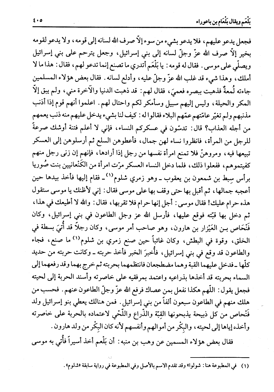 ويصلي على موسى فقال له قومه يا بلعم أتدري ما تصنع إنما تدعو لهم فقاهذا ما لا أملك وهذا شئ قد غلب الله عز وجل عليه وأدلع لسانه فقال بعض هؤلاء المسلمين جاءته لمعة فذهبت ببصره فعمي فقال لهم قد ذهبت الدنيا والآخرة مني ولم يبق إلا المكر والحيلة وليس إليهم سبيل وسأمكر لكم واحتال لهم اعلموا أنهم قوم إذا أذنب مذنبهم ولم تغير عامتهم عمهم البلاء فقالوا له كيف لنا بشئ يدخل عليهم منه ذنب يعمهم من أجله العذاب قال تدسون في عسكركم النساء فإني لا أعلم فتنة أوشك صرعة للرجل من المرأة فانظروا نساء لهن جمال فأعطوهن السلع ثم أرسلوهن إلى العسكر تبيعها فيه ومروهن فلا تمنع امرأة نفسها من رجل إذا أرادها فإنهم إن زنى رجل منهم كفيتموهم ففعلوا ذلك فلما دخل النساء العسكر مرت امرأة من الكنعانيين بنت صوريا برأس سبط بن شمعون بن يعقوب وهو زمري شلوم (1) فقام إليها فأخذ بيدها حين أعجبه جمالها ثم أقبل بها حتى وقف بها على موسى فقال إني لأظنك يا موسى ستقول هذه حرام عليك فقال موسى أجل إنها حرام فلا تقربها فقال والله لا أطيعك في هذا ثم دخل بها قبته فوقع عليها فأرسل الله عز وجل الطاعون في بني إسرائيل وكان فنحاص بن العيزار بن هارون وهو صاحب أمر موسى وكان رجلا قد أتي بسطة في الخلق وقوة في البطش وكان غائبا حين صنع زمري بن شلوم ما صنع فجاء والطاعون قد وقع في بني إسرائيل فأخبر الخبر فأخذ حربته وكانت حربته من حديد كلها فدخل عليهما القبة وهما مضطجعان فانتظمهما بحربته ثم خرج بهما وقد رفعهما إلى السماء بحربته قد أخذها بذراعيه واعتمد بمرفقيه على خاصرته وأسند الحربة إلى لحيته فجعل يقول اللهم هكذا نفعل بمن عصاك فرفع الله عز وجل الطاعون عنهم فحسب من هلك منهم في الطاعون سبعون ألفا من بني إسرائيل فمن هنالك يعطي بنو إسرائيل ولد فنحاص من كل ذبيحة يذبحونها القبة والذراع واللحي لا عتماده بالحربة على خاصرته وأخذه إياها إلى لحيته والبكر من أموالهم وأنفسهم لأنه كان البكر من ولد هارون فقال بعض هؤلاء المسمين عن وهب بن منبه أن بلعم اخذ أسيرا فأتي به موسى