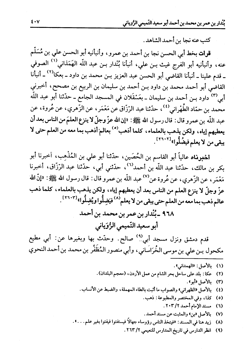 كتب عنه نجا بن أحمد الشاهد قرأت بخط أبي الحسن نجا بن أحمد بن عمرو وأنبأنيه أبو الحسن علي بن مسلم عنه وأنبأنيه أبو الفرج غيث بن علي أنبأنا بندار بن عبد الله الهمذاني (1) الصوفي قدم علينا أنبأنا القاضي أبو الحسن عبد العزيز بن محمد بن داود بعكا (2) أنبأنا القاضي أبو أحمد محمد بن داود بن أحمد بن سليمان بن الربيع بن مصحح أخبرني أبي (3) داود بن أحمد بن سليمان بعسقلان في المسجد الجامع حدثنا أبو عبد الله محمد بن حماد الطهراني (4) حدثنا عبد الرزاق عن معمر عن الزهري عن عروة عن عبد الله بن عمرو قال قال رسول الله (صلى الله عليه وسلم) إن الله عز وجل لا ينزع العلم من الناس بعد أن يعطيهم إياه ولكن يذهب بالعلماء كلما أذهب (5) بعالم أذهب بما معه من العلم حتى لا يبقى من لا يعلم فيضلوا