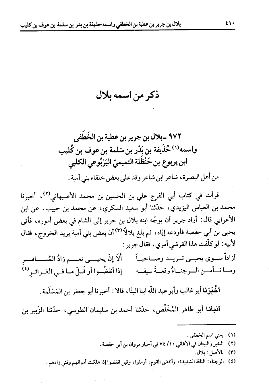 972 - بلال بن جرير بن عطية بن الخطفى واسمه (1) حذيفة بن بدر بن سلمة بن عوف بن كليب ابن يربوع بن حنظلة التميمي اليربوعي الكلبي من أهل البصرة شاعر ابن شاعر وفد على بعض خلفاء بني أمية قرأت في كتاب أبي الفرج علي بن الحسين بن محمد الأصبهاني (2) أخبرنا محمد بن العباس اليزيدي حدثنا أبو سعيد السكري عن محمد بن حبيب عن ابن الأعرابي قال أراد جرير أن يوجه ابنه بلال بن جرير إلى الشام في بعض أموره فأتى يحيى بن ابي حفصة فأودعه إياه ثم بلغ بلالا (3) أن بعض بني أمية يريد الخروج فقال لأبيه لو كلفت هذا القرشي أمري فقال جرير * أزادا سوى يحيى تريد وصاحبا * ألا إن يحيى نعم زاد المسافر وما تأمن الوجناء وقعة سيفه * إذا أنفضوا أو قل ما في الغرائر (4) أخبرنا أبو غالب وأبو عبد الله ابنا البنا قالا أخبرنا أبو جعفر بن المسلمة أنبأنا أبو طاهر المخلص حدثنا أحمد بن سليمان الطوسي حدثنا الزبير بن
