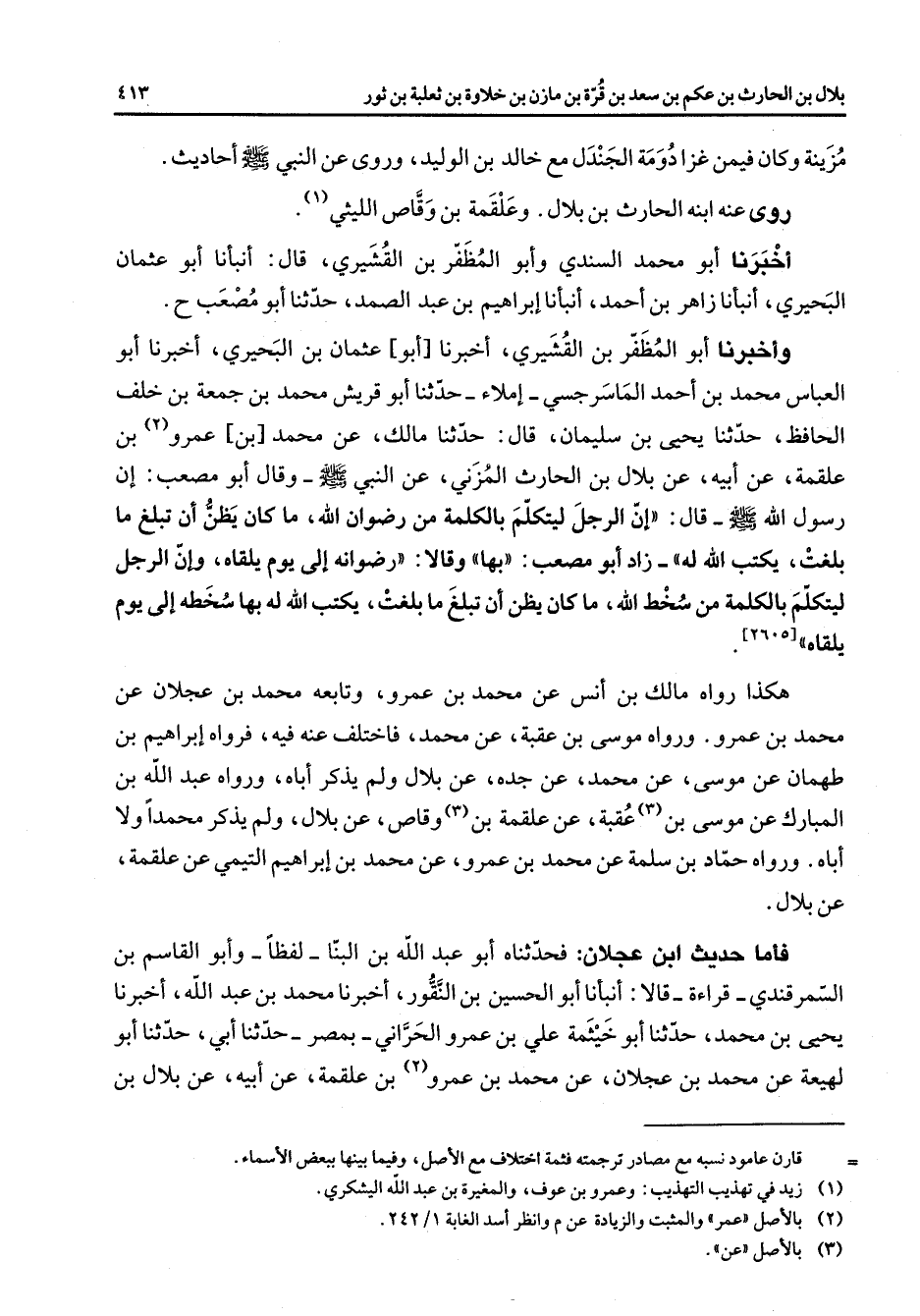 أخبرنا أبو محمد السندي وأبو المظفر بن القشيري قال أنبأنا أبو عثمان البحيري أنبأنا زاهر بن أحمد أنبأنا إبراهيم بن عبد الصمد حدثنا أبو مصعب ح وأخبرنا أبو المظفر بن القشيري أخبرنا أبو عثمان بن البحيري أخبرنا أبو العباس محمد بن أحمد الماسرجسي إملاء حدثنا أبو قريش محمد بن جمعة بن خلف الحافظ حدثنا يحيى بن سليمان قال حدثنا مالك عن محمد بن عمرو (2) بن علقمة عن أبيه عن بلال بن الحارث المزني عن النبي (صلى الله عليه وسلم) وقال أبو مصعب إن رسول الله (صلى الله عليه وسلم) قال إن الرجل ليتكلم بالكلمة من رضوان الله ما كان يظن أن تبلغ ما بلغت يكتب الله له زاد أبو مصعب بها وقالا رضوانه إلى يوم يلقاه وإن الرجل ليتكلم بالكلمة من سخط الله ما كان يظن أن تبلغ ما بلغت يكتب الله له بها سخطه إلى يوم يلقاه