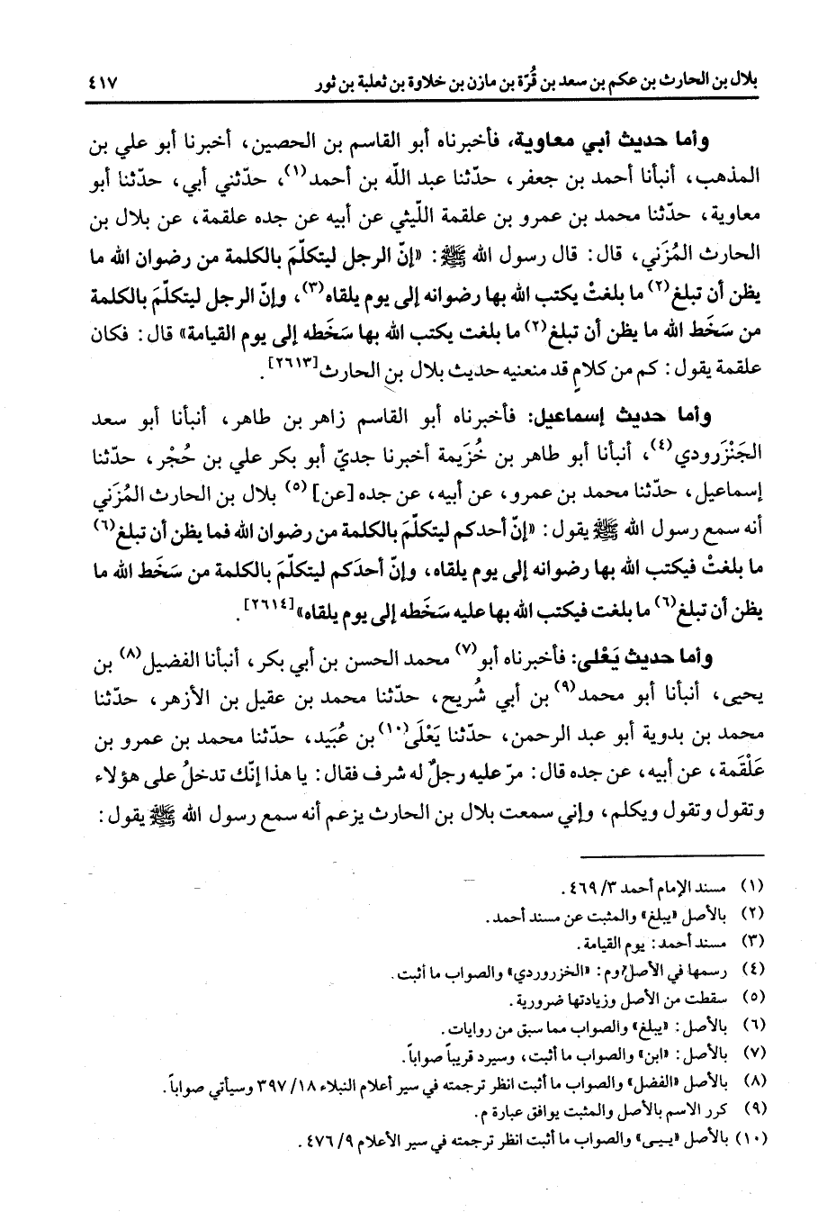 وأما حديث أبي معاوية فأخبرناه أبو القاسم بن الحصين أخبرنا أبو علي بن المذهب أنبأنا أحمد بن جعفر حدثنا عبد الله بن أحمد (1) حدثني أبي حدثنا أبو معاوية حدثنا محمد بن عمرو بن علقمة الليثي عن أبيه عن جده علقمة عن بلال بن الحارث المزني قال قال رسول الله (صلى الله عليه وسلم) إن الرجل ليتكلم بالكلمة من رضوان الله ما يظن أن تبلغ (2) ما بلغت يكتب الله بها رضوانه إلى يوم يلقاه (3) وإن الرجل ليتكلم بالكلمة من سخط الله ما يظن أن تبلغ (2) ما بلغت يكتب الله بها سخطه إلى يوم القيامة قال فكان علقمة يقول كم من كلام قد منعنيه حديث بلال بن الحارث