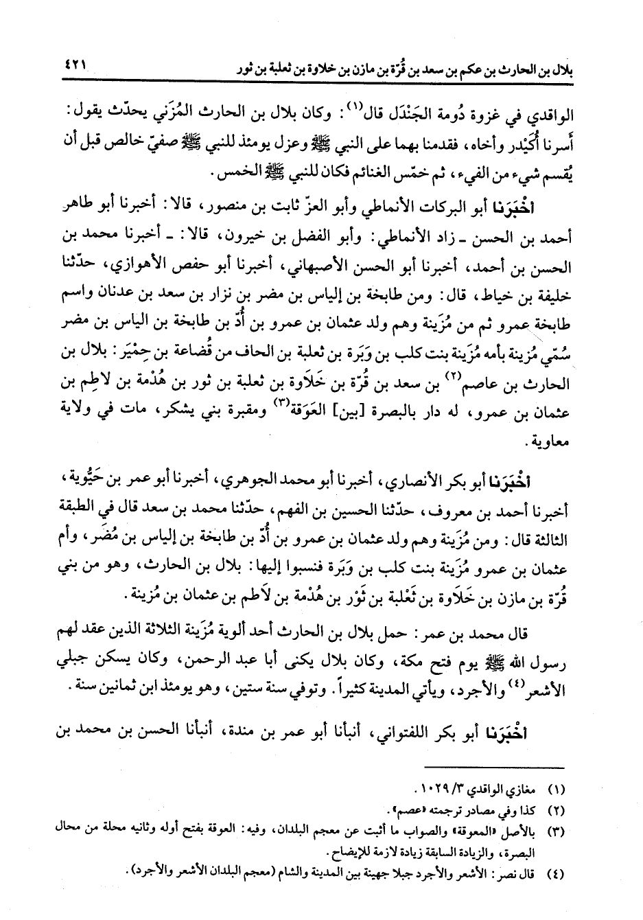 الواقدي في غزوة دومة الجندل قال (1) وكان بلال بن الحار ث المزني يحدث يقول أسرنا أكيدر وأخاه فقدمنا بهما على النبي (صلى الله عليه وسلم) وعزل يومئذ للنبي (صلى الله عليه وسلم) صفي خالص قبل أن يقسم شئ من الفئ ثم خمس الغنائم فكان للنبي (صلى الله عليه وسلم) الخمس أخبرنا أبو البركات الأنماطي وأبو العز ثابت بن منصور قالا أخبرنا أبو طاهر أحمد بن الحسن زاد الأنماطي وأبو الفضل بن خيرون قالا أخبرنا محمد بن الحسن بن أحمد أخبرنا أبو الحسن الأصبهاني أخبرنا أبو حفص الأهوازي حدثنا خليفة بن خياط قال ومن طابخة بن إلياس بن مضر بن نزار بن سعد بن عدنان واسم طابخة عمرو ثم من مزينة وهم ولد عثمان بن عمرو بن أد بن طابخة بن إلياس بن مضر سمي مزينة بأمه مزينة بنت كلب بن وبرة بن ثعلبة بن الحاف من قضاعة بن حمير بلال بن الحارث بن عاصم (2) بن سعد بن قرة بن خلاوة بن ثعلبة بن ثور بن هدمة بن لاطم بن عثمان بن عمرو له دار بالبصرة بين العوقة (3) ومقبرة بني يشكر مات في ولاية معاوية أخبرنا أبو بكر الأنصاري أخبرنا أبو محمد الجوهري أخبرنا أبو عمر بن حيوية أخبرنا أحمد بن معروف حدثنا الحسين بن الفهم حدثنا محمد بن سعد قال في الطبقة الثالثة قال ومن مزينة وهم ولد عثمان بن عمرو بن أد بن طابخة بن إلياس بن مضر وأم عثمان بن عمرو مزينة بنت كلب بن وبرة فنسبوا إليها بلال بن الحارث وهو من بني قرة ابن مازن بن خلاوة بثعلبة بن ثور بن هدمة بن لاطم بن عثمان بن مزينة قال محمد بن عمر حمل بلال بن الحارث أحد ألوية مزينة الثلاثة الذين عقد لهم رسول الله (صلى الله عليه وسلم) يوم فتح مكة وكان بلال يكنى أبا عبد الرحمن وكان يسكن جبلي الأشعر (4) والأجرد ويأتي المدينة كثيرا وتوفي سنة ستين وهو يؤمنذ ابن ثمانين سنة أخبرنا أبو بكر اللفتواني أنبأنا أبو عمر بن مندة أنبأنا الحسن بن محمد بن