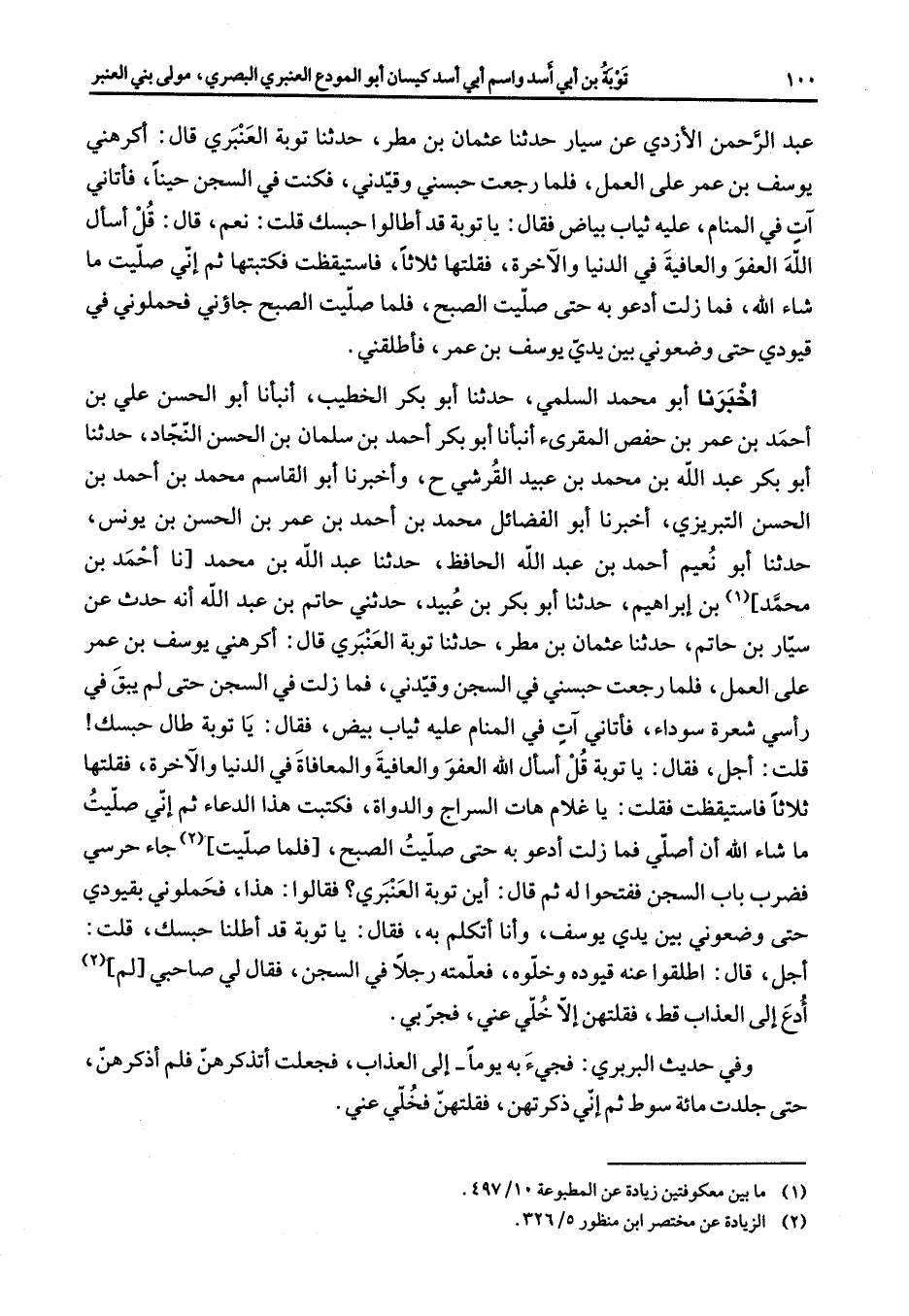 عبد الرحمن الأزدي عن سيار حدثنا عثمان بن مطر حدثنا توبة العنبري قال أكرهني يوسف بن عمر على العمل فلما رجعت حبسني وقيدني فكنت في السجن حينا فأتاني آت في المنام عليه ثياب بياض فقال يا توبة قد أطالوا حبسك قلت نعم قال قل أسأل الله العفو والعافية في الدنيا والآخرة فقلتها ثلاثا فاستيقظت فكتبتها ثم إني صليت ما شاء الله فما زلت أدعو به حتى صليت الصبح فلما صليت الصبح جاؤني فحملوني في قيودي حتى وضعوني بين يدي يوسف بن عمر فأطلقني أخبرنا أبو محمد السلمي حدثنا أبو بكر الخطيب أنبأنا أبو الحسن علي بن أحمد بن عمر بن حفص المقرئ أنبأنا أبو بكر أحمد بن سلمان بن الحسن النجاد حدثنا أبو بكر عبد الله بن محمد بن عبيد القرشي ح وأخبرنا أبو القاسم محمد بن أحمد بن الحسن التبريزي أخبرنا أبو الفضائل محمد بن أحمد بن عمر بن الحسن بن يونس حدثنا أبو نعيم أحمد بن عبد الله الحافظ حدثنا عبد الله بن محمد نا أحمد بن محمد (1) بن إبراهيم حدثنا أبو بكر بن عبيد حدثني حاتم بن عبد الله أنه حدث عن سيار بن حاتم حدثنا عثمان بن مطر حدثنا توبة العنبري قال أكرهني يوسف بن عمر على العمل فلما رجعت حبسني في السحن وقيدني فما زلت في السجن حتى لم يبق في رأسي شعرة سوداء فأتاني آت في المنام عليه ثياب بيض فقال يا توبة طال حبسك قلت أجل فقال يا توبة قل أسال الله العفو والعافية والمعافاة في الدنيا والآخرة فقلتها ثلاثا فاستيقظت فقلت يا غلام هات السراج والدواة فكتبت هذا الدعاء ثم إني صليت ما شاء الله أن أصلي فما زلت أدعو به حتى صليت الصبح فلما صليت جاء حرسي فضرب باب السجن ففتحوا له ثم قال أين توبة العنبري فقالوا هذا فحملوني بقيودي حتى وضعوني بين يدي يوسف وأنا أتكلم به فقال يا توبة قد أطلنا حبسك قلت أجل قال اطلقوا عنه قيوده وخلوه فعلمته رجلأ في السجن فقال لي صاحبي لم أدع إلى العذاب قط فقلتهن إلا خلي عني فجربي وفي حديث البربري فجئ به يوما إلى العذاب فجعلت أتذكرهن فلم أذكرهن حتى جلدت مائة سوط ثم إني ذكرتهن فقلتهن فخلي عني