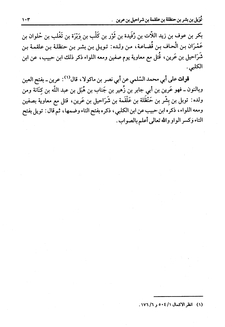 بكر بن عوف بن زيد اللات بن رفيدة بن ثور بن كلب بن وبرة بن تغلب بن حلوان بن عمران بن الحاف بن قضاعة من ولده تويل بن بشر بن حنظلة بن علقمة بن شراحيل بن عرين قتل مع معاوية يوم صفين ومعه اللواء ذكر ذلك ابن حبيب عن ابن الكلبي قرأت على أبي محمد السلمي عن أبي نصر بن ماكولا قال (1) عرين بفتح العين وبالنون فهو عرين بن أبي جابر بن زهير بن جناب بن هبل بن عبد الله بن كنانة ومن ولده توبل بن بشر بن حنظلة بن علقمة بن شراحيل بن عرين قتل مع معاوية بصفين ومعه اللواء ذكره ابن حبيب عن ابن الكلبي ذكره بفتح التاء وضمها ثم قال تويل بفتح التاء وكسر الواو والله تعالى أعلم بالصواب "