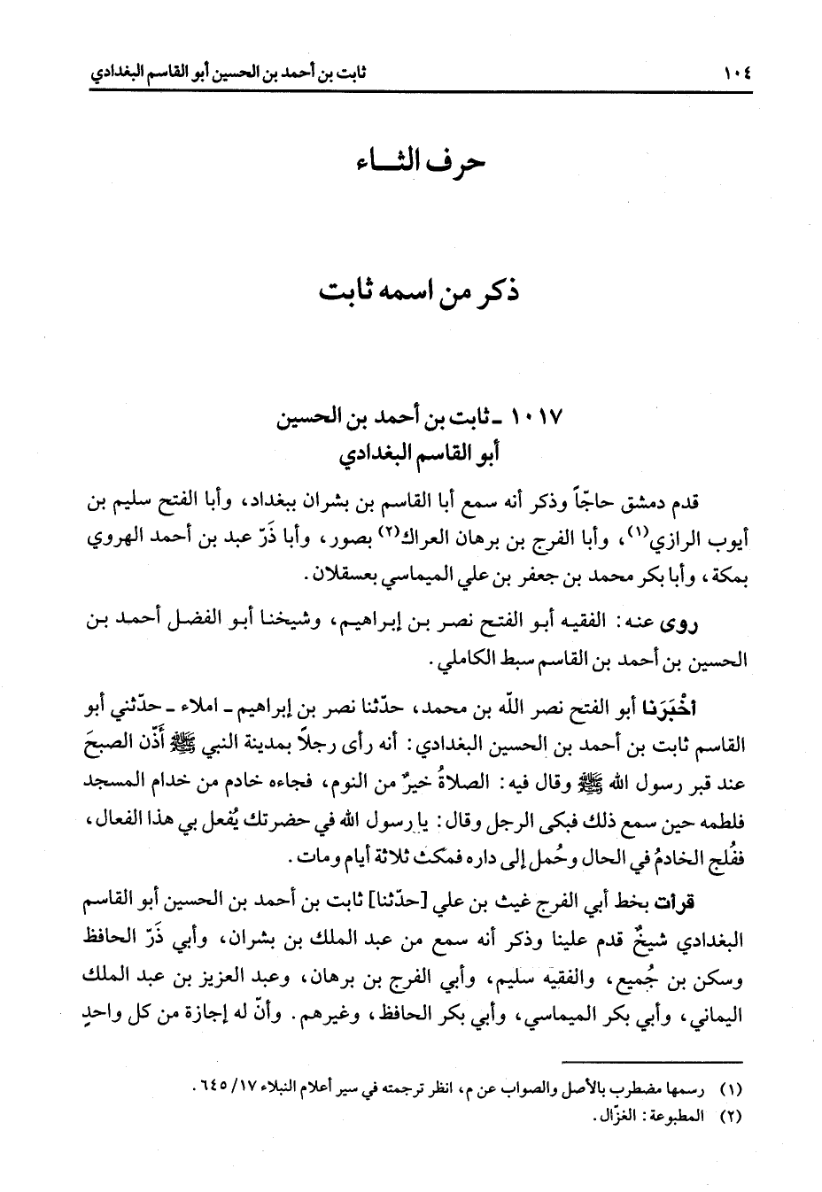 1017 - ثابت بن أحمد بن الحسين أبو القاسم البغدادي قدم دمشق حاجا وذكر أنه سمع أبا القاسم بن بشران ببغداد وأبا الفتح سليم بن أيوب الرازي (1) وأبا الفرج بن برهان العراك (2) بصور وأبا ذر عبد بن أحمد الهروي بمكة وأبا بكر محمد بن جعفر بن علي الميماسي بعسقلان روى عنه الفقيه أبو الفتح نصر بن إبراهيم وشيخنا أبو الفضل أحمد بن الحسين بن أحمد بن القاسم سبط الكاملي اخبرنا أبو الفتح نصر الله بن محمد حدثنا نصر بن إبراهيم إملاء حدثني أبو القاسم ثابت بن أحمد بن الحسين البغدادي أنه رأى رجلا بمدينة النبي (صلى الله عليه وسلم) أذن الصبح عند قبر رسول الله (صلى الله عليه وسلم) وقال فيه الصلاة خير من النوم فجاءه خادم من خدام المسجد فلطمه حين سمع ذلك فبكى الرجل وقال يا رسول الله في حضرتك يفعل بي هذا الفعال ففلج الخادم في الحال وحمل إلى داره فمكث ثلاثة أيام ومات قرأت بخط أبي الفرج غيث بن علي حدثنا ثابت بن أحمد بن الحسين أبو القاسم البغدادي شيخ قدم علينا وذكر أنه سمع من عبد الملك بن بشران وأبي ذر الحافظ وسكن بن جميع والفقيه سليم وأبي الفرج بن برهان وعبد العزيز بن عبد الملك اليماني وأبي بكر الميماسي وأبي بكر الحافظ وغيرهم وأن له إجازة من كل واحد