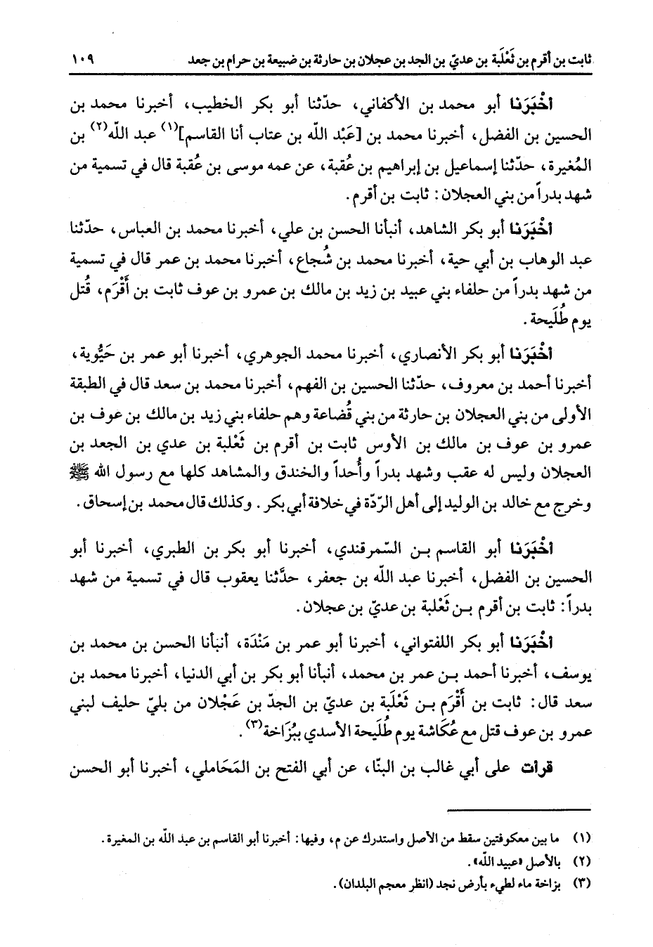 أخبرنا أبو محمد بن الأكفاني حدثنا أبو بكر الخطيب اخبرنا محمد بن الحسين بن الفضل أخبرنا محمد بن عبد الله بن عتاب أنا القاسم (1) عبد الله (2) بن المغيرة حدثنا إسماعيل بن إبراهيم بن عقبة عن عمه موسى بن عقبة قال في تسمية من شهد بدر أمن بني العجلان ثابت بن أقرم أخبرنا أبو بكر الشاهد أنبأنا الحسن بن علي أخبرنا محمد بن العباس حدثنا عبد الوهاب بن أبي حية أخبرنا محمد بن شجاع أخبرنا محمد بن عمر قال في تسمية من شهد بدرا من حلفاء بني عبيد بن زيد بن مالك بن عمرو بن عوف ثابت بن أقرم قتل يوم طليحة أخبرنا أبو بكر الأنصاري أخبرنا محمد الجوهري اخبرنا أبو عمر بن حيوية أخبرنا أحمد بن معروف حدثنا الحسين بن الفهم أخبرنا محمد بن سعد قال في الطبقة الأولى من بني العجلان بن حارثة من بني قضاعة وهم حلفاء بني زيد بن مالك بن عوف بن عمرو بن عوف بن مالك بن الأوس ثابت بن أقرم بن ثعلبة بن عدي بن الجعد بن العجلان وليس له عقب وشهد بدرا واحدا والخندق والمشاهد كلها مع رسول الله (صلى الله عليه وسلم) وخرج مع خالد بن الوليد إلى أهل الردة في خلافة أبي بكر وكذلك قال محمد بن إسحاق أخبرنا أبو القاسم بن السمرقندي أخبرنا أبو بكر بن الطبري أخبرنا أبو الحسين بن الفضل أخبرنا عبد الله بن جعفر حدثنا يعقوب قال في تسمية من شهد بدرا ثابت بن أقرم بن ثعلبة بن عدي بن عجلان أخبرنا أبو بكر اللفتواني أخبرنا أبو عمر بن مندة أنبأنا الحسن بن محمد بن يوسف أخبرنا أحمد بن عمر بن محمد أنبأنا أبو بكر بن أبي الدنيا أخبرنا محمد بن سعد قال ثابت بن أقرم بن ثعلبة بن عدي بن الجد بن عجلان من بلي حليف لبني عمرو بن عوف قتل مع عكاشة يوم طليحة الأسدي ببزاخة (3) قرأت على أبي غالب بن البنا عن أبي الفتح بن المحاملي أخبرنا أبو الحسن