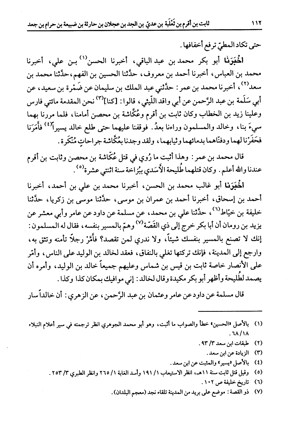 حتى تكادالمطي ترفع أخفافها أخبرنا أبو بكر محمد بن عبد الباقي أخبرنا الحسن (1) بن علي أخبرنا محمد بن العباس أخبرنا أحمد بن معروف حدثنا الحسين بن الفهم حدثنا محمد بن سعد (2) أخبرنا محمد بن عمر حدثني عبد الملك بن سليمان عن ضمرة بن سعيد عن أبي سلمة بن عبد الرحمن عن أبي واقد الليثي قالوا كنا (3) نحن المقدمة مائتي فارس وعلينا زيد بن الخطاب وكان ثابت بن أقرم وعكاشة بن محصن أمامنا فلما مررنا بهما سئ بنا وخالد والمسلمون وراءنا بعد فوقضنا عليهما حتى طلع خالد يسيرا (4) فأمرنا فحفرنا لهما ودفناهما بدمائهما وثيابهما ولقد وجدنا بعكاشة جراحات منكرة قال محمد بن عمر وهذا أثبت ما روي في قتل عكاشة بن محصن وثابت بن أقرم عندنا والله أعلم وكان قتلهما طليحة الأسدي ببزاخة سنة اثنتي عشرة (5) أخبرنا أبو غالب محمد بن الحسن أخبرنا محمد بن علي بن أحمد أخبرنا أحمد بن إسحاق أخبرنا أحمد بن عمران بن موسى حدثنا موسى بن زكريا حدثنا خليفة بن خياط (6) حدثنا علي بن محمد عن مسلمة عن داود عن عامر وأبي معشر عن يزيد بن رومان أن أبا بكر خرج إلى ذي القصة (7) وهم بالمسير بنفسه فقال له المسلمون إنك لا تصنع بالمسير بنفسك شيئا ولا ندر لمن تقصد فأمر رجلا تأمنه وتثق به وأرجع إلى المدينة فإنك تركتها تغلي بالنفاق فعقد لخالد بن الوليد على الناس وأمر على الأنصار خاصة ثابت بن قيس بن شماس وعليهم جميعا خالد بن الوليد وأمره أن يصمد لطليحة وأظهر أبو بكر مكيدة وقال لخالد إني موافيك بمكان كذا وكذا قال مسلمة عن داود عن عامر وعثمان بن عبد الرحمن عن الزهري أن خالدا سار