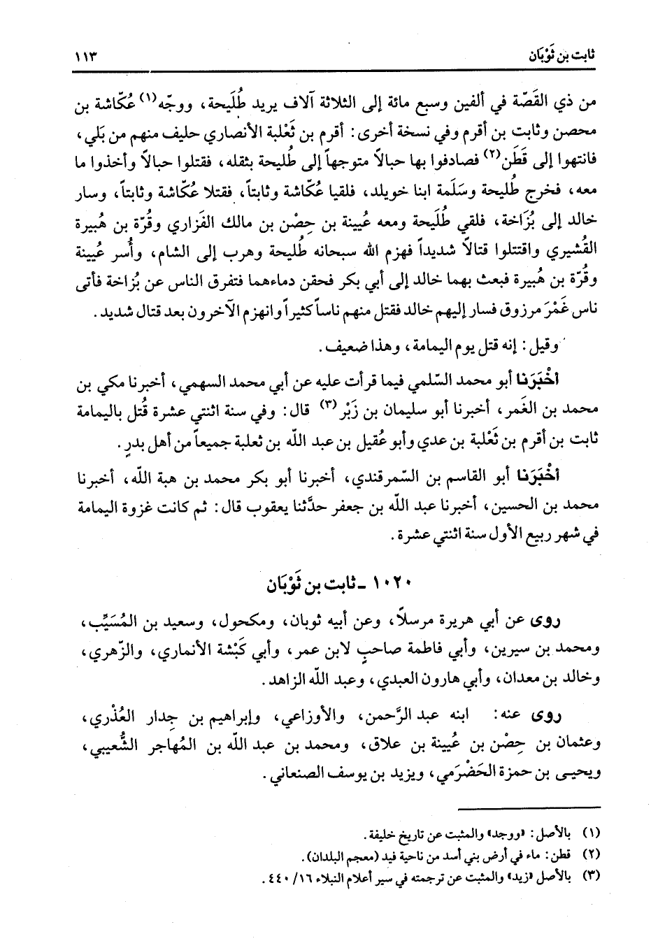 من ذي القصة في الفين وسبع مائة إلى الثلاثة آلاف يريد طليحة ووجه (1) عكاشة بن محصن وثابت بن أقرم وفي نسخة أخرى أقرم بن ثعلبة الأنصاري حليف منهم من بلي فانتهوا إلى قطن (2) فصادفوا بها حبالا متوجها إلى طليحة بثقله فقتلوا حبالا وأخذوا ما معه فخرج طليحة وسلمة ابنا خويلد فلقيا عكاشة وثابتا فقتلا عكاشة وثابتا وسار خالد إلى بزاخة فلقي طليحة ومعه عيينة بن حصن بن مالك الفزاري وقرة بن هبيرة القشيري واقتتلوا قتالا شديدا فهزم الله سبحانه طليحة وهرب إلى الشام وأسر عيينة وقرة بن هبيرة فبعث بهما خالد إلى أبي بكر فحقن دماءهما فتفرق الناس عن بزاخة فأتى ناس غمر مرزوق فسار إليهم خالد فقتل منهم ناسا كثيرا وانهزم الآخرون بعد قتال شديد وقيل إنه قتل يوم اليمامة وهذا ضعيف أخبرنا أبو محمد السلمي فيما قرأت عليه عن أبي محمد السهمي أخبرنا مكي بن محمد بن الغمر أخبرنا أبو سليمان بن زبر (3) قال وفي سنة اثنتي عشرة قتل باليمامة ثابت بن أقرم بن ثعلبة بن عدي وأبو عقيل بن عبد الله بن ثعلبة جميعا من أهل بدر أخبرنا أبو القاسم بن السمرقندي أخبرنا أبو بكر محمد بن هبة الله أخبرنا محمد بن الحسين أخبرنا عبد الله بن جعفر حدثنا يعقوب قال ثم كانت غزوة اليمامة في شهر ربيع الأول سنة اثنتي عشرة