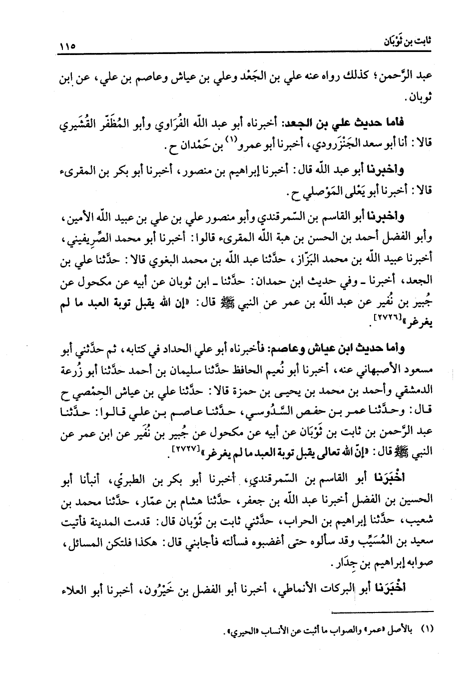 [2726] وأما حديث ابن عياش وعاصم فأخبرناه أبو علي الحاد في كتابه ثم حدثني أبو مسعود الأصبهاني عنه أخبرنا أبو نعيم الحافظ حدثنا سليمان بن أحمد حدثنا أو زرعة الدمشقي وأحمد بن محمد بن يحيى بن حمزة قالا حدثنا علي بن عياش الحمصي ح قال وحدثنا عمر بن حفص السدوسي حدثنا عاصم بن علي قالوا حدثنا عبد الرحمن بن ثابت بن ثوبان عن أبيه عن مكحول عن جبير بن نفير عن ابن عمر عن