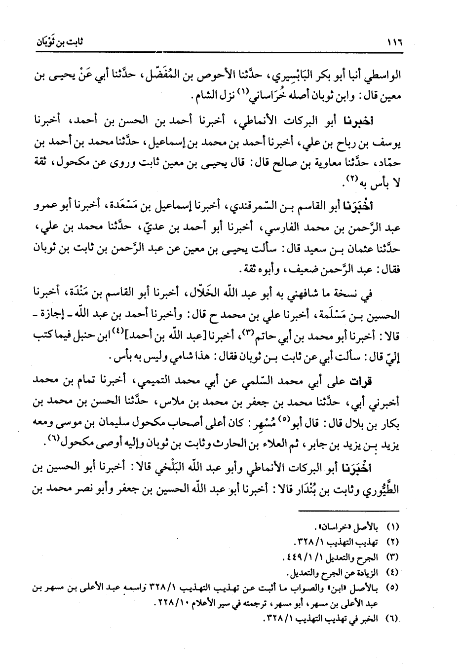 الواسطي أنبأ أبو بكر البابسيري حدثنا الأحوص بن المفضل حدثنا أبي عن يحيى بن معين قال وابن ثوبان أصله خراساني (1) نزل الشام أخبرنا أبو البركات الأنماطي أخبرنا أحمد بن الحسن بن أحمد أخبرنا يوسف بن رباح بن علي أخبرنا أحمد بن محمد بن إسماعيل حدثنا محمد بن أحمد بن حماد حدثنا معاوية بن صالح قال قال يحيى بن معين ثابت وروى عن مكحول ثقة لا بأس به (2) أخبرنا أبو القاسم بن السمرقندي أخبرنا إسماعيل بن مسعدة أخبرنا أبو عمرو عبد الرحمن بن محمد الفارسي أخبرنا أبو أحمد بن عدي حدثنا محمد بن علي حدثنا عثمان بن سعيد قال سألت يحيى بن معين عن عبد الرحمن بن ثابت بن ثوبان فقال عبد الرحمن ضعيف وأبوه ثقة في نسخة ما شافهني به أبو عبد الله الخلال أخبرنا أبو القاسم بن مندة أخبرنا الحسين بن مسلمة أخبرنا علي بن محمد ح قال وأخبرنا أحمد بن عبد الله إجازة قالا أخبرنا أبو محمد بن أبي حاتم (3) أخبرنا عبد الله بن أحمد (4) ابن حنبل فيما كتب إلي قال سألت أبي عن ثابت بن ثوبان فقال هذا شامي وليس به بأس قرأت على أبي محمد السلمي عن أبى محمد التميمي أخبرنا تمام بن محمد أخبرني أبي حدثنا محمد بن جعفر بن محمد بن ملاس حدثنا الحسن بن محمد بن بكاربن بلال قال قال أبو مسهر كان أعلى أصحاب مكحول سليمان بن موسى ومعه يزيد بن يزيد بن جابر ثم العلاء بن الحارث وثابت بن ثوبان وإليه أوصى مكحول أخبرنا أبو البركات الأنماطي وأبو عبد الله البلخي قالا أخبرنا أبو الحسين بن الطيوري وثابت بن بندار قالا أخبرنا أبو عبد الله الحسين بن جعفر وأبو نصر محمد بن