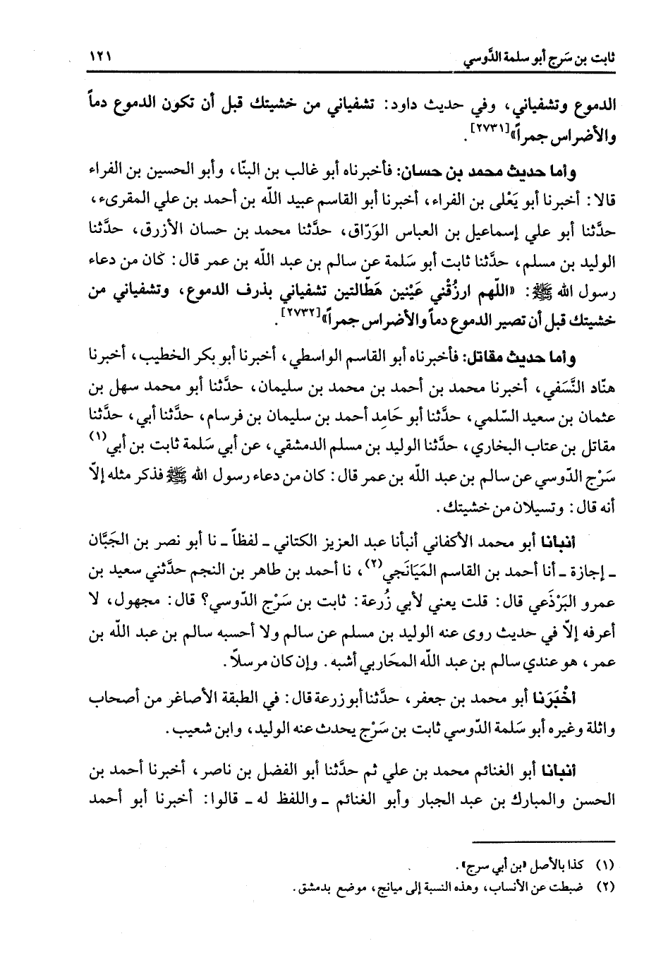 [2732] ح وأما حديث مقاتل فأخبرناه أبو القاسم الواسطي أخبرنا أبو بكر الخطيب أخبرنا هناد النسفي أخبرنا محمد بن أحمد بن محمد بن سليمان حدثنا أبو محمد سهل بن عثمان بن سعيد السلمي حدثنا أبو حامد أحمد بن سليمان بن فرسام حدثنا أبي حدثنا مقاتل بن عتاب البخاري حدثنا الوليد بن مسلم الدمشقي عن أبي سلمة ثابت بن أبي (1) سرج الدوسي عن سالم بن عبد الله بن عمر قال كان من دعاء رسول الله (صلى الله عليه وسلم) فذكر مثله إلا انه قال وتسيلان من خشيتك أنبأنا أبو محمد الأكفاني أنبانا عبد العزيز الكتاني لفظا نا أبو نصر بن الجبان إجازة أنا أحمد بن القاسم الميانجي (2) نا أحمد بن طاهر بن النجم حدثني سعيد بن عمرو البرذعي قال قلت يعني لأبي زرعة ثابت بن سرج الدوسي قال مجهول لا أعرفه إلا في حديث روى عنه الوليد بن مسلم عن سالم ولا أحسبه سالم بن عبد الله بن عمر هو عندي سالم بن عبد الله المحاربي أشبه وإن كان مرسلا أخبرنا أبو محمد بن جعفر حدثنا أبو زرعة قال في الطبقة الأصاغر من أصحاب واثلة وغيره أبو سلمة الدوسي ثابت بن سرج يحدث عنه الوليد وابن شعيب أنبأنا أبو الغنائم محمد بن علي ثم حدثنا أبو الفضل بن ناصر أخبرنا أحمد بن الحسن والمبارك بن عبد الجبار وأبو الغنائم واللفظ له قالوا أخبرنا أبو أحمد