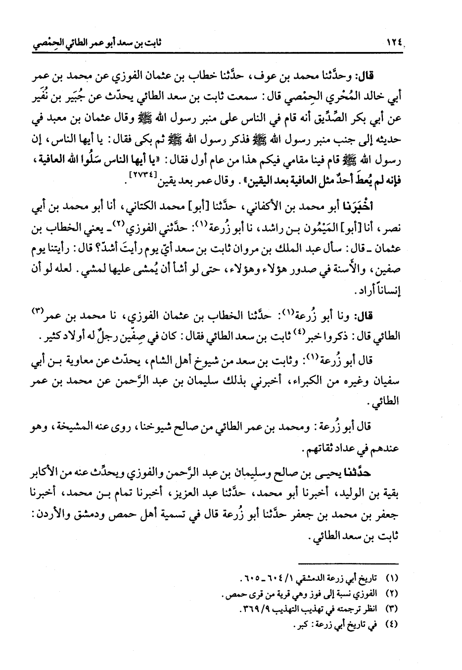 [2734] ح أخبرنا أبو محمد بن الأكفاني حدثنا أبو محمد الكتاني أنا أبو محمد بن أبي نصر أنا أبو الميمون بن راشد نا أبو زرعة (1) حدثني الفوزي (2) يعني الخطاب عثمان قال سأل عبد الملك بن مروان ثابت بن سعد أي يوم رأيت أشد قال رأيتنا يوم صفين والأسنة في صدور هؤلاء وهؤلاء حتى لو اشأ أن يمشى عليها لمشي لعله لو أن إنسانا أراد قال ونا أبو زرعة (1) حدثنا الخطاب بن عثمان الفوزي نا محمد بن عمر (4) الطائي قال ذكروا خبر ثابت بن سعد الطائي فقال كان في صفين رجل له أولاد كثير قال أبو زرعة وثابت بن سعد من شيوخ أهل الشام يحدث عن معاوية بن أبي سفيان وغيره من الكبراء أخبرني بذلك سليمان بن عبد الرحمن عن محمد بن عمر الطائي قال أبو زرعة ومحمد بن عمر الطائي من صالح شيوخنا روى عنه المشيخة وهو عندهم في عداد ثقاتهم حدثنا يحي بن صالح وسليمان بن عبد الرحمن والفوزي ويحدث عنه من الأكابر بقية بن الوليد أخبرنا أبو محمد حدثنا عبد العزيز أخبرنا تمام بن محمد أخبرنا جعفر بن محمد بن جعفر حدثنا أبو زرعة قال في تسمية أهل حمص ودمشق والأردن ثابت بن سعد الطائي