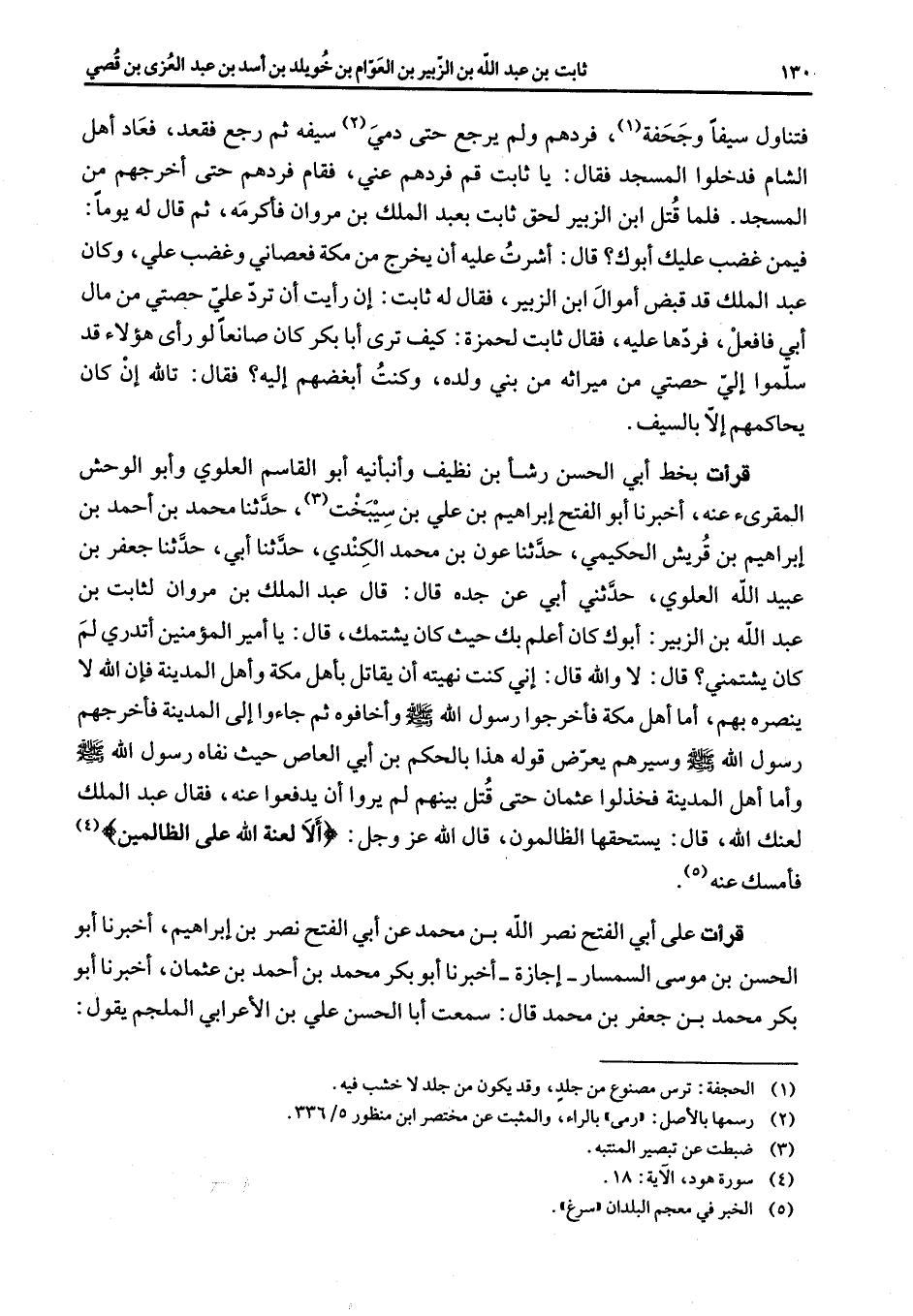 فتناول سيفا وجحفه (1) فردهم ولم يرجع حتى دمي (2) سيفه ثم رجع فقعد فعاد أهل الشام فدخلوا المسجد فقال يا ثابت قم فردهم عني فقام فردهم حتى أخرجهم من المسجد فلما قتل ابن الزبير لحق ثابت بعبد الملك بن مروان فأكرمه ثم قال له يوما فيمن غضب عليك أبوك قال أشرت عليه أن يخرج من مكة فعصاني وغضب علي وكان عبد الملك قد قبض أموال ابن الزبير فقال له ثابت إن رايت أن ترد علي حصتي من مال أبي فافعل فردها عليه فقال ثابت لحمزة كيف ترى أبا بكر كان صانعا لو رأى هؤلاء قد سلموا إلي حصتي من ميراثه من بني ولده وكنت أبغضهم إليه فقال تالله إن كان يحاكمهم إلا بالسيف قرأت بخط أبي الحسن رشا بن نظيف وأنبأنيه أبو القاسم العلوي وأبو الوحش المقرئ عنه أخبرنا أبو الفتح إبراهيم بن علي بن سيبخت (3) حدثنا محمد بن أحمد بن إبراهيم بن قريش الحكيمي حدثنا عون بن محمد الكندي حدثنا أبي حدثنا جعفر بن عبيد الله العلوي حدثني أبي عن جده قال قال عبد الملك بن مروان لثابت بن عبد الله بن الزبير أبوك كان اعلم بك حيث كان يشتمك قال يا أمير المؤمنين أتدري لم كان يشتمني قال لا والله قال إني كنت نهيته أن يقاتل بأهل بمكة وأهل المدينة فإن الله لا ينصره بهم أما أهل مكة فأخرجوا رسول الله (صلى الله عليه وسلم) وأخافوه ثم جاءوا إلى المدينة فأخرجهم رسول الله (صلى الله عليه وسلم) وسيرهم يعرض قوله هذا بالحكم بن أبي العاص حيث نفاه رسول الله (صلى الله عليه وسلم) وأما أهل المدينة فخذلوا عثمان حتى قتل بينهم لم يروا أن يدفعوا عنه فقال عبد الملك لعنك الله قال يستحقها الظالمون قال الله عز وجل " ألا لعنة الله على الظالمين " (4) فأمسك عنه (5) قرأت على أبي الفتح نصر الله بن محمد عن أبي الفتح نصر بن إبراهيم أخبرنا أبو الحسن بن موسى السمسار إجازة أخبرنا أبو بكر محمد بن أحمد بن عثمان أخبرنا أبو بكر محمد بن جعفر بن محمد قال سمعت أبا الحسن علي بن الإعرابي الملجم يقول