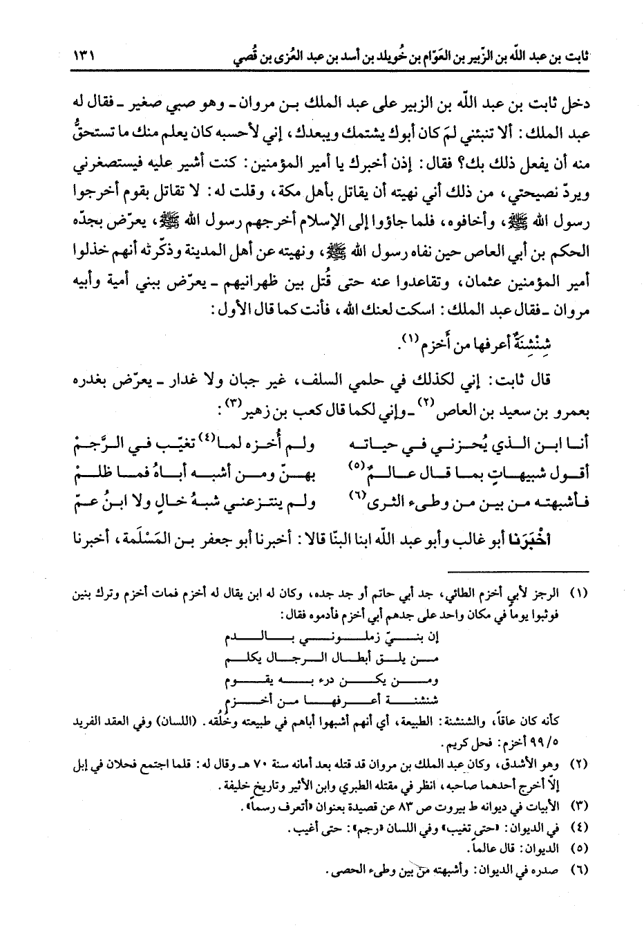 دخل ثابت بن عبد الله بن الزبير على عبد الملك بن مروان وهو صبي صغير فقال له عبد الملك ألا تنبئني لم كان أبوك يشتمك ويبعدك إني لأحسبه كان يعلم منك ما تستحق منه أن يفعل ذلك بك فقال إذن أخبرك يا أمير المؤمنين كنت أشير عليه فيستصغرني ويرد نصيحتي من ذلك أني نهيته أن يقاتل بأهل مكة وقلت له لا تقاتل بقوم أخرجوا رسول الله (صلى الله عليه وسلم) وأخافوه فلما جاؤوا إلى الإسلام أخرجهم رسول الله (صلى الله عليه وسلم) يعرض بجده الحكم بن أبي العاص حين نفاه رسول الله (صلى الله عليه وسلم) ونهيته عن أهل المدينة وذكرته أنهم خذلوا أمير المؤمنين عثمان وتقاعدوا عنه حتى قتل بين ظهرانيهم يعرض ببني أمية وأبيه مروان فقال عبد الملك اسكت لعنك الله فأنت كما قال الأول شنش نة أعرفها من أخزم (1) قال ثابت إني لكذلك في حلمي السلف غير جبان ولا غدار يعرض بغدره بعمرو بن سعيد بن العاص (2) وإني لكما قال كعب بن زهير (3) أنا ابن الذي يحزني في حياته * ولم أخزه لما (4) تغيب في الرجم أقول شبيهات بما قال عالم (5) * بهن ومن أشبه أباه فما ظلم فأشبهته من بين من وطئ الثرى (6) * ولم ينتزعني شبه خال ولا ابن عم * أخبرنا أبو غالب وأبو عبد الله ابنا البنا قالا أخبرنا أبو جعفر بن المسلمة