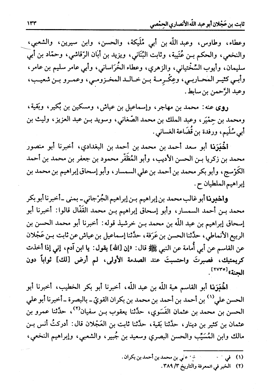 [2735] ح أخبرنا أبو القاسم هبة الله بن عبد الله أخبرنا أبو بكر الخطيب أخبرنا أبو الحسن علي (1) بن أحمد بن أحمد بن محمد بن بكران القوي بالبصرة أخبرنا أبو علي الحسن بن محمد بن عثمان الفسوي حدثنا يعقوب بن سفيان (2) حدثنا عمرو بن عثمان بن كثير بن دينار حدثنا بقية حدثنا ثابت بن العجلان قال أدركت أنس بن مالك وابن المسيب والحسن البصري وسعيد بن جبير والشعبى وإبراهيم النخعي