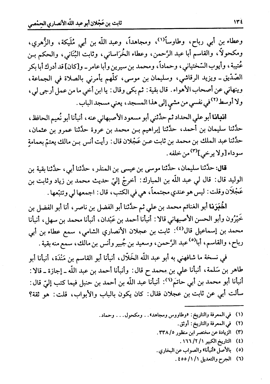 وعطاء بن أبي رباح وطاوسا (1) ومجاهدا وعبد الله بن أبي مليكة والزهري ومكحولا والقاسم أبا عبد الرحمن وعطاء الخراساني وثابت البناني والحكم بن عتيبة وأيوب السختياني وحمادا ومحمد بن سيرين وأبا عامر وكان قد أدرك أبا بكر الصديق ويزيد الرقاشي وسليمان بن موسى كلهم يأمرني بالصلاة في الجماعة وينهاني عن أصحاب الأهواء قال بقية ثم بكى وقال يا ابن أخي ما من عمل أرجى لي ولا أوسط (2) في نفسي من مشي إلى هذا المسجد يعني مسجد الباب أنبأنا أبو علي الحداد ثم حدثني أبو مسعود الأصبهاني عنه أنبانا أبو نعيم الحافظ حدثنا سليمان بن أحمد حدثنا إبراهيم بن محمد بن عروة حدثنا عمرو بن عثمان حدثنا عبد الملك بن محمد بن ثابت عن عجلان قال رأيت أنس بن مالك يعتم بعمامة سوداء ولا يرخي (3) من خلفه قال حدثنا سليمان حدثنا موسى بن عيسى بن المنذر حدثنا أبي حدثنا بقية الوليد قال قال لي عبد الله بن المبارك أخرج إلي حديث محمد بن زياد وثابت بن عجلان وقلت ليس هو عندي مجتمعا هي في الكتب قال اجمعها لي وتتبعها أخبرنا أبو الغنائم محمد بن علي ثم حدثنا أبو الفضل بن ناصر أنا أبو الفضل بن خيرون وأبو الحسن الأصبهاني قالا أنبأنا أحمد بن عبدان أنبأنا محمد بن سهل أنبأنا محمد بن إسماعيل قال (4) ثابت بن عجلان الأنصاري الشامي سمع عطاء بن أبي رباح والقاسم أبا (5) عبد الرحمن وسعيد بن جبير وأنس بن مالك سمع منه بقية في نسخة ما شافهني به أبو عبد الله الخلال أنبأنا أبو القاسم بن مندة أنبأنا أبو طاهر بن سلمة انبأنا علي بن محمد ح قال وأنبأنا أحمد بن عبد الله إجازة قالا أنبأنا أبو محمد بن أبي حاتم (6) أنبأنا عبد الله بن أحمد بن حنبل فيما كتب إلي قال سألت أبي عن ثابت بن عجلان فقال كان يكون بالباب والأبواب قلت هو ثقة