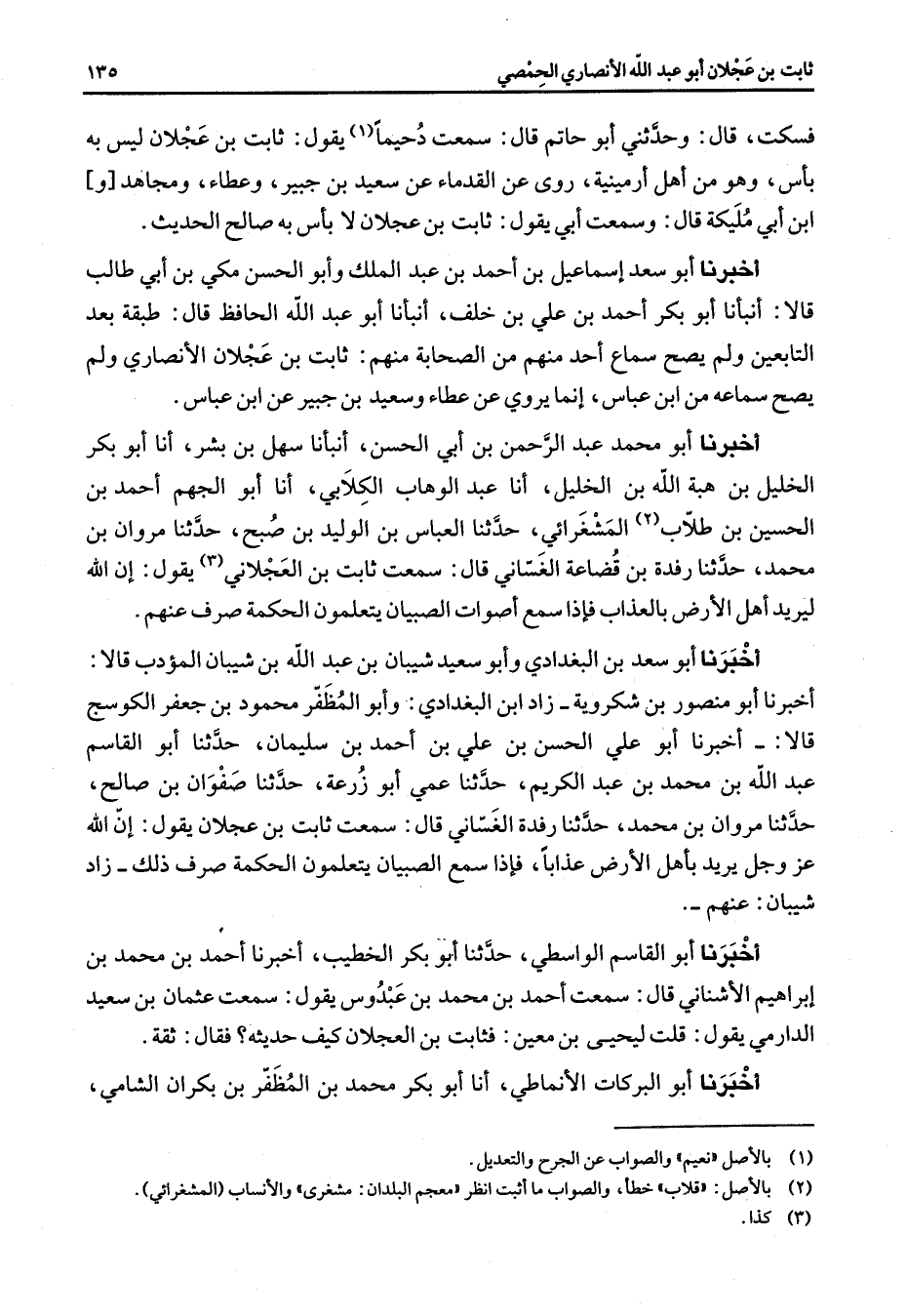 فسكت قال وحدثني أبو حاتم قال سمعت دحيما (1) يقول ثابت بن عجلان ليس به بأس وهو من أهل أرمينة روى عن القدماء عن سعيد بن جبير وعطاء ومجاهد وابن أبي مليكة قال وسمعت أبي يقول ثابت بن عجلان لا بأس به صالح الحديث أخبرنا أبو سعد إسماعيل بن أحمد بن عبد الملك وأبو الحسن مكي بن أبي طالب قالا أنبأنا أبو بكر أحمد بن علي بن خلف أنبأنا أبو عبد الله الحافظ قال طبقة بعد التابعين ولم يصح سماع أحد منهم من الصحابة منهم ثابت بن عجلان الأنصاري ولم يصح سماعه من ابن عباس إنما يروي عن عطاء وسعيد بن جبير عن ابن عباس أخبرنا أبو محمد عبد الرحمن بن أبي الحسن أنبأنا سهل بن بشر أنا أبو بكر الخليل بن هبة الله بن الخليل أنا عبد الوهاب الكلابي أنا أبو الجهم أحمد بن الحسين بن طلاب (2) المشفرائي حدثنا العباس بن الوليد بن صبح حدثنا مروان بن محمد حدثنا رفدة بن قضاعة الغساني قال سمعت ثابت بن العجلاني (3) يقول إن الله ليريد أهل الأرض بالعذاب فإذا سمع أصوات الصبيان يتعلمون الحكمة صرف عنهم أخبرنا أبو سعد بن البغدادي وأبو سعيد شيبان بن عبد الله بن شيبان المؤدب قالا أخبرنا أبو منصور بن شكرويه زاد ابن البغدادي وأبو المظفر محمود بن جعفر الكوسج قالا أخبرنا أبو علي الحسن بن علي بن أحمد بن سليمان حدثنا أبو القاسم عبد الله بن محمد بن عبد الكريم حدثنا عمي أبو زرعة حدثنا صفوان بن صالح حدثنا مروان بن محمد حدثنا رفدة الغساني قال سمعت ثابت بن عجلان يقول إن الله عز وجل يريد بأهل الأرض عذابا فإذا سمع الصبيان يتعلمون الحكمة صرف ذلك زاد شيبان عنهم اخبرنا أبو القاسم الواسطي حدثنا أبو بكر الخطيب أخبرنا أحمد بن محمد بن إبراهيم الأشناني قال سمعت أحمد بن محمد بن عبدوس يقول سمعت عثمان بن سعيد الدارمي يقول قلت ليحيى بن معين فثابت بن العجلان كيف حديثه فقال ثقة أخبرنا أبو البركات الأنماطي أنا أبو بكر محمد بن المظفر بن بكران الشامي