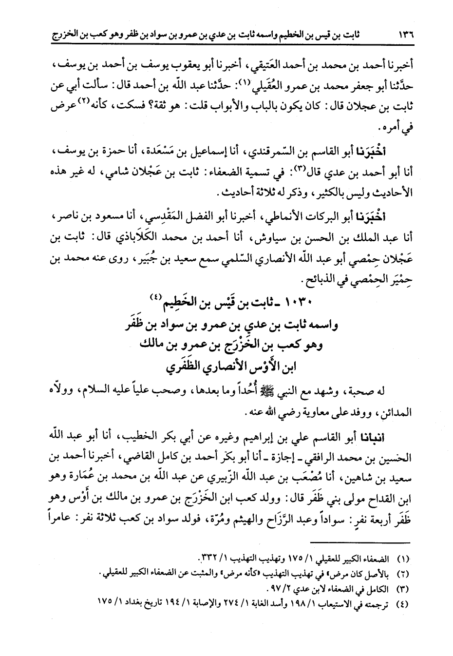 1030 - ثابت بن قيس بن الخطيم (4) واسمه ثابت بن عدي بن عمرو بن سواد بن ظفر وهو كعب بن الخزرج بن عمرو بن مالك ابن الأوس الأنصاري الظفري له صحبة وشهد مع النبي (صلى الله عليه وسلم) أحدا وما بعدها وصحب عليا عليه السلام وولاه المدائن ووفد على معاوية Bهـ أنبأنا أبو القاسم علي بن إبراهيم وغيره عن أبي بكر الخطيب أنا أبو عبد الله الحسين بن محمد الرافقي إجازة أنا أبو بكر أحمد بن كامل القاضي أخبرنا أحمد بن سعيد بن شاهين أنا مصعب بن عبد الله الزبيري عن عبد الله بن محمد بن عمارة وهو أبو القداح مولى بني ظفر قال وولد كعب ابن الخزرج بن عمرو بن مالك بن أوس وهو ظفر أربعة نفر سوادا وعبد الرزاح والهيثم ومرة فولد سواد بن كعب ثلاثة نفر عامرا