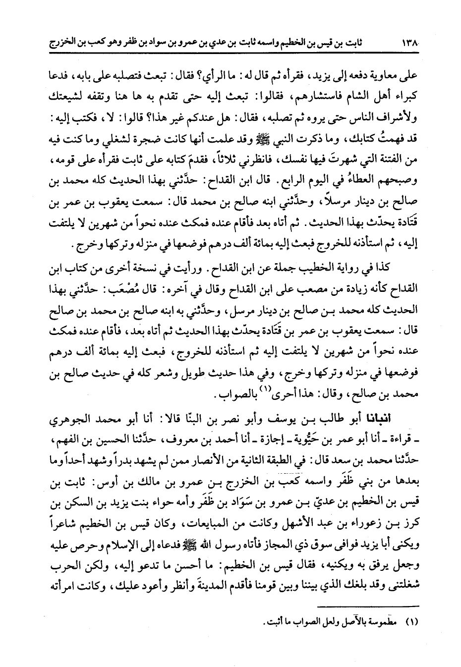 على معاوية دفعه إلى يزيد فقرأه ثم قال له ما الرأي فقال تبعث فتصلبه على بابه فدعا كبراء أهل الشام فاستشارهم فقالوا تبعث إليه حتى تقدم به ها هنا وتقفه لشيعتك ولأشراف الناس حتى يروه ثم تصلبه فقال هل عندكم غير هذا قالوا لا فكتب إليه قد فهمت كتابك وما ذكرت النبي (صلى الله عليه وسلم) وقد علمت أنها كانت ضجرة لشغلي وما كنت فيه من الفتنة التي شهرت فيها نفسك فانظرني ثلاثا فقدم كتابه على ثابت فقرأه على قومه وصبحهم العطاء في اليوم الرابع قال ابن القداح حدثني بهذا الحديث كله محمد بن صالح بن دينار مرسلا وحدثني ابنه صالح بن محمد قال سمعت يعقوب بن عمر بن قتادة يحدث بهذا الحديث ثم أتاه بعد فأقام عنده فمكث عنده نحوا من شهرين لا يلتفت إليه ثم استأذنه للخروج فبعث إليه بمائة ألف درهم فوضعها في منزله وتركها وخرج كذا في رواية الخطيب جملة عن ابن القداح ورأيت في نسخة أخرى من كتاب ابن القداح كأنه زيادة من مصعب على ابن القداح وقال في آخره قال مصعب حدثني بهذا الحديث كله محمد بن صالح بن دينار مرسل وحدثني به ابنه صالح بن محمد بن صالح قال سمعت يعقوب بن عمر بن قتادة يحدث بهذا الحديث ثم أتاه بعد فأقام عنده فمكث عنده نحوا من شهرين لا يلتفت إليه ثم استأذنه للخروج فبعث إليه بمائة ألف درهم فوضعها في منزله وتركها وخرج وفي هذا حديث طويل وشعر كله في حديث صالح بن محمد بن صالح وقال هذا أحرى (1) بالصواب أنبأنا أبو طالب بن يوسف وأبو نصر بن البنا قالا أنا أبو محمد الجوهري قراءة أنا أبو عمر بن حيوية إجازة أنا أحمد بن معروف حدثنا الحسين بن الفهم حدثنا محمد بن سعد قال في الطبقة الثانية من الأنصار ممن لم يشهد بدرا وشهد أحدا وما بعدها من بني ظفر واسمه كعب بن الخزرج بن عمرو بن مالك بن أوس ثابت بن قيس بن الخطيم بن عدي بن عمرو بن سواد بن ظفر وأمه حواء بنت يزيد بن السكن بن كرز بن زعوراء بن عبد الأشهل وكانت من المبايعات وكان قيس بن الخطيم شاعرا ويكنى أبا يزيد فوافى سوق ذي المجاز فأتاه رسول الله (صلى الله عليه وسلم) فدعاه إلى الإسلام وحرص عليه وجعل يرفق به ويكنيه فقال قيس بن الخطيم ما أحسن ما تدعو إليه ولكن الحرب شغلتني وقد بلغك الذي بيننا وبين قومنا فأقدم المدينة وأنظر وأعود عليك وكانت امرأته
