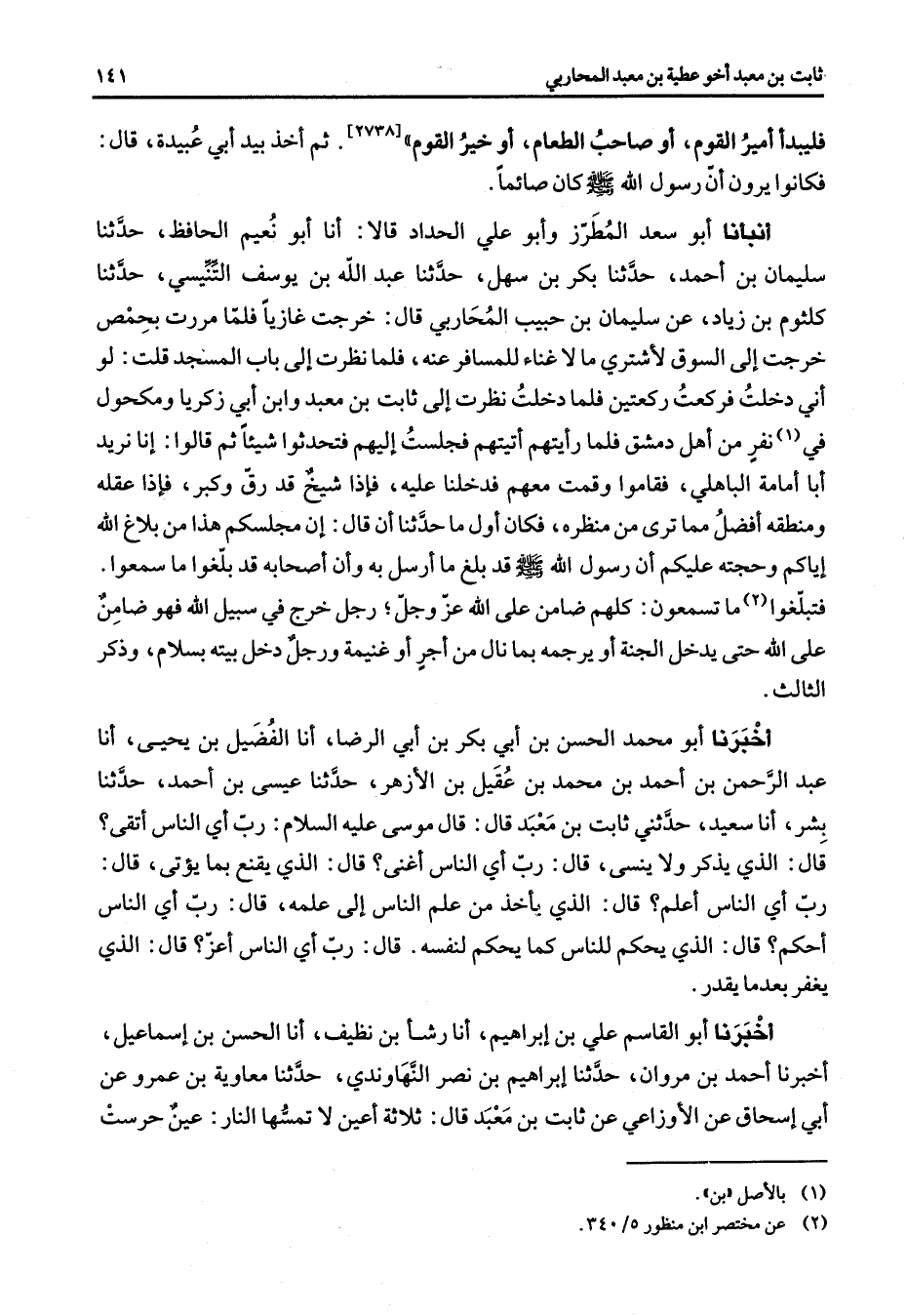 [2738] ح ثم أخذ بيد أبي عبيدة قال فكانوا يرون أن رسول الله (صلى الله عليه وسلم) كان صائما أنبأنا أبو سعد المطرز وأبو علي الحداد قالا أنا أبو نعيم الحافظ حدثنا سليمان بن أحمد حدثنا بكر بن سهل حدثنا عبد الله بن يوسف التنيسي حدثنا كلثوم بن زياد عن سليمان بن حبيب المحاربي قال خرجت غازيا فلما مررت بحمص خرجت إلى السوق لأشتري ما لاغناء للمسافر عنه فلما نظرت إلى باب المسجد قلت لو أني دخلت فركعت ركعتين فلما دخلت نظرت إلى ثابت بن معبد وابن أبي زكريا ومكحول في (1) نفر من أهل دمشق فلما رأيتهم أتيتهم فجلست إليهم فتحدثوا شيئا ثم قالوا إنا نريد أبا أمامة الباهلى فقاموا وقمت معهم فدخلنا عليه فإذا شيخ قد رق وكبر فإذا عقله ومنطقه أفضل مما ترى من منظره فكان أول ما حدثنا أن قال إن مجلسكم هذا من بلاغ الله إياكم وحجته عليكم أن رسول الله (صلى الله عليه وسلم) قد بلغ ما أرسل به وأن اصحابه قد بلغوا ما سمعوا فتبلغوا (2) ما تسمعون كلهم ضامن على الله عز وجل رجل خرج في سبيل الله فهو ضامن على الله حتى يدخل الجنة أو يرجمه بما نال من أجر أو غنيمة دخل بيته بسلام وذكر الثالث أخبرنا أبو محمد الحسن بن أبي بكر بن أبي الرضا أنا الفضيل بن يحيى أنا عبد الرحمن بن أحمد بن محمد بن عقيل بن الأزهر حدثنا عيسى بن أحمد حدثنا بشر أنا سعيد حدثني ثابت بن معبد قال قال موسى عليه السلام رب أي الناس أتقى قال الذي يذكر ولا ينسى قال رب أي الناس أغنى قال الذي يقنع بما يؤتى قال رب أي الناس أعلم قال الذي يأخذ من علم الناس إلى علمه قال رب أي الناس أحكم قال الذي يحكم للناس كما يحكم لنفسه قال رب أي الناس أعز قال الذي يغفر بعدما يقدر أخبرنا أبو القاسم علي بن إبراهيم أنا رشأ بن نظيف أنا الحسن بن إسماعيل أخبرنا أحمد بن مروان حدثنا إبراهيم بن نصر النهاوندي حدثنا معاوية بن عمرو عن أبي إسحاق عن الأوزاعي عن ثابت بن معبد قال ثلاثة أعين لا تمسها النار عين حرست
