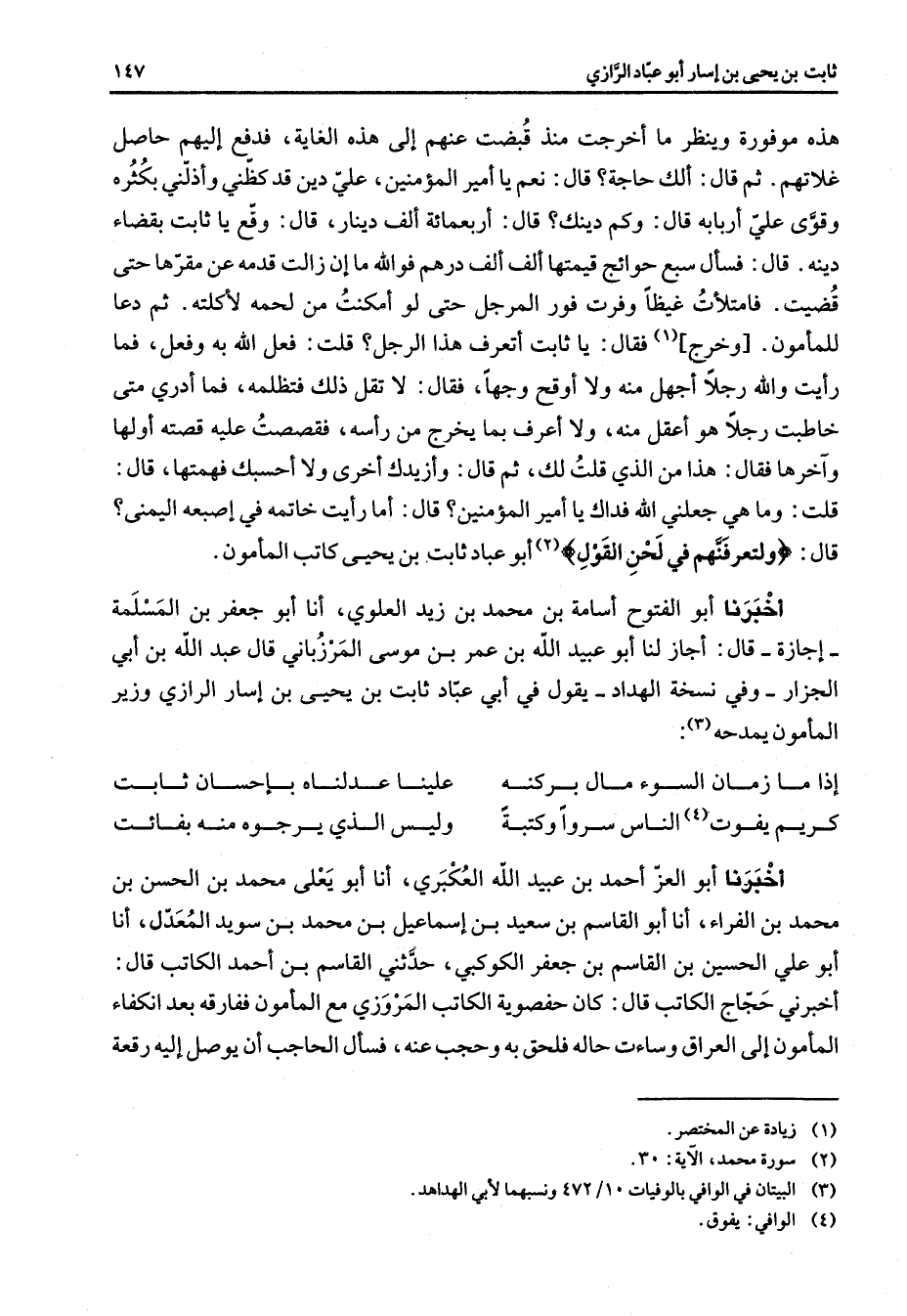 هذه موفورة وينظر ما أخرجت منذ قبضت عنهم إلى هذه الغاية فدفع إليهم حاصل غلاتهم ثم قال ألك حاجة قال نعم يا أمير المؤمنين علي دين قد كظني وأذلني بكثرة وقوى علي أربابه قال وكم دينك قال أربعمائة ألف دينار قال وقع يا ثابت بقضاء دينه قال فسأل سبع حوائج قيمتها ألف ألف درهم فو الله ما إن زالت قدمه عن بمقرها حتى قضيت فامتلأت غيظا وفرت فور المرجل حتى لو أمكنت من لحمه لأكلته ثم دعا للمأمون (1) وخرج فقال يا ثابت أتعرف هذا الرجل قلت فعل الله به وفعل فما رأيت والله رجلا أجهل منه ولا أوقح وجها فقال لا تقل ذلك فتظلمه فما أدري متى خاطبت رجلا هو أعقل منه ولا أعرف بما يخرج من رأسه فقصصت عليه قصته أولها وآخرها فقال هذا من الذي قلت لك ثم قال وأزيدك أخرى ولا أحسبك فهمتها قال قلت وما هي جعلني الله فداك يا أمير المؤمنين قال أما رأيت خاتمه في إصبعه اليمنى قال " ولتعرفنهم في لحن القول " (2) أبو عباد ثابت بن يحيى كاتب المأمون أخبرنا أبو الفتوح أسامة بن محمد بن زيد العلوي أنا أبو جعفر بن المسلمة إجازة قال أجاز لنا أبو عبيد الله بن عمر بن موسى المزرباني قال عبد الله بن أبي الجزار وفي نسخة الهداد يقول في أبي عباد ثابت بن يحيى بن إسار الرازي وزير المأمون يمدحه (3) إذا ما زمان السوء مال بركنه * علينا عدلناه بإحسان ثابت كريم يفوت (4) الناس سرورا وكتبة * وليس الذي يرجوه منه بفائت * أخبرنا أبو العز أحمد بن عبيد الله العكبري أنا أبو يعلى محمد بن الحسن بن محمد بن الفراء أنا أبو القاسم بن سعيد بن إسماعيل بن محمد بن سويد المعدل أنا أبو علي الحسين بن القاسم بن جعفر الكوكبي حدثني القاسم بن أحمد الكاتب قال أخبرني حجاج الكاتب قال كان حفصوية الكاتب المروزي مع المأمون ففارقه بعد انكفاء المأمون إلى العراق وساءت حاله فلحق به وحجب عنه فسأله الحاجب أن يوصل إليه رقعة