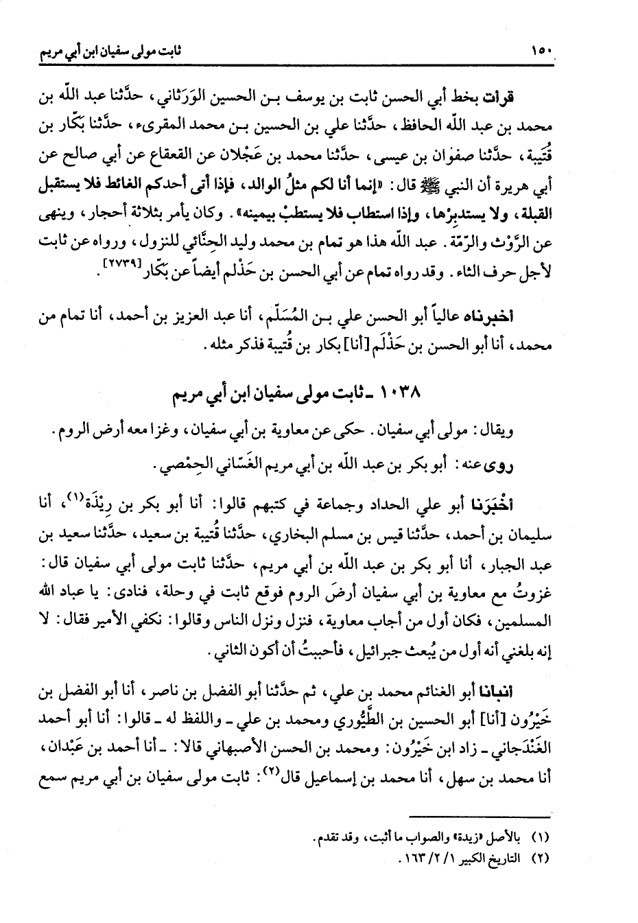 1038 - ثابت مولى سفيان ابن أبي مريم ويقال مولى أبي سفيان حكى عن معاوية بن أبي سفيان وغزا معه أرض الروم روى عنه أبو بكر بن عبد الله بن أبي مريم الغساني الحمصي أخبرنا أبو علي الحداد وجماعة في كتبهم قالوا أنا أبو بكر بن ريذة (1) أنا سليمان بن أحمد حدثنا قيس بن مسلم البخاري حدثنا قتيبة بن سعيد حدثنا سعيد بن عبد الجبار أنا أبو بكر بن عبد الله بن أبي مريم حدثنا ثابت مولى أبي سفيان قال غزوت مع معاوية بن أبي سفيان أرض الروم فوقع ثابت في وحلة فنادى يا عباد الله المسلمين فكان أول من أجاب معاوية فنزل ونزل الناس وقالوا نكفي الأمير فقال لا أنه بلغني أنه أول من يبعث جبرائيل فأحببت أن أكون الثاني أنبأنا أبو الغنائم محمد بن علي ثم حدثنا أبو الفضل بن ناصر أنا أبو الفضل بن خيرون أنا أبو الحسين بن الطيوري ومحمد بن علي واللفظ له قالوا أنا أبو أحمد الغندجاني زاد ابن خيرون ومحمد بن الحسن الأصبهاني قالا أنا أحمد بن عبدان أنا محمد بن سهل أنا محمد بن إسماعيل قال (2) ثابت مولى سفيان بن أبي مريم سمع
