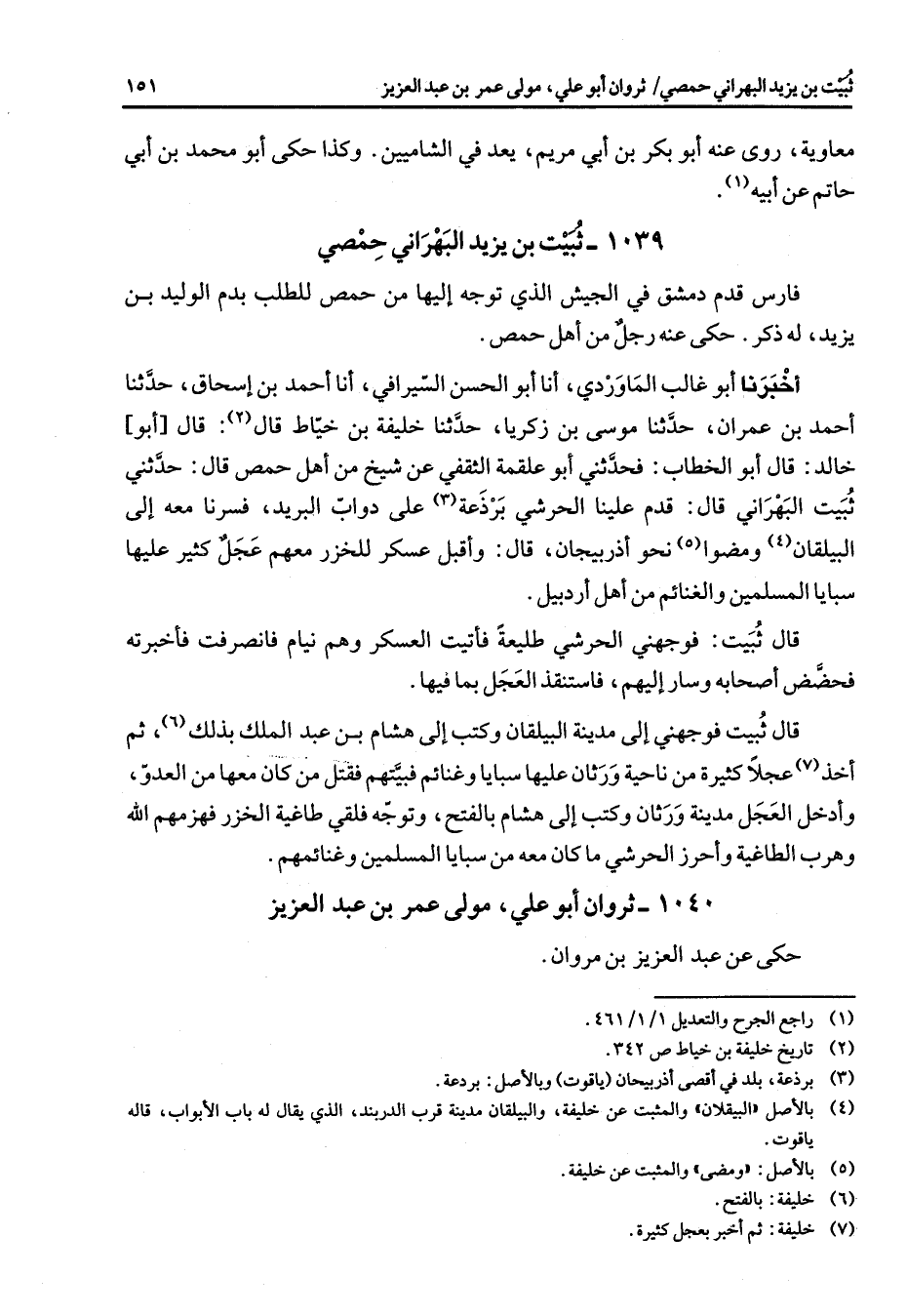 1039 - ثبيت بن يزيد البهراني حمصي فارس قدم دمشق في الجيش الذي توجه إليها من حمص للطلب بدم الوليد بن يزيد له ذكر حكى عنه رجل من أهل حمص أخبرنا أبو غالب الماوردي أنا أبو الحسن السيرافي أنا أحمد بن إسحاق حدثنا أحمد بن عمران حدثنا موسى بن زكريا حدثنا خليفة بن خياط قال (2) قال أبو خالد قال أبو الخطاب فحدثني أبو علقمة الثقفي عن شيخ من أهل حمص قال حدثني ثبيت البهراني قال قدم علينا الحرشي برذعة (3) على دواب البريد فسرنا معه إلى البيلقان (4) ومضوا (5) نحو أذربيجان قال وأقبل عسكر للخزر معهم عجل كثير عليها سبايا المسلمين والغنائم أهل أردبيل قال ثبيت فوجهني الحرشي طليعة فأتيت العسكر وهم نيام فانصرفت فأخبرته فحضض أصحابه وسار إليهم فاستنقذ العجل بما فيها قال ثبيت فوجهني إلي مدينة البيلقان وكتب إلى هشام بن عبد الملك بذلك (6) ثم أخذ (7) عجلا كثيرة من ناحية ورثان عليها سبايا وغنائم فبيتهم فقتل من كان معها من العدو وأدخل العجل مدينة ورثان وكتب إلى هشام بالفتح وتوجه فلقي طاغية الخزر فهزمهم الله وهرب الطاغية وأحرز الحرشي ما كان معه من سبايا المسلمين وغنائمهم