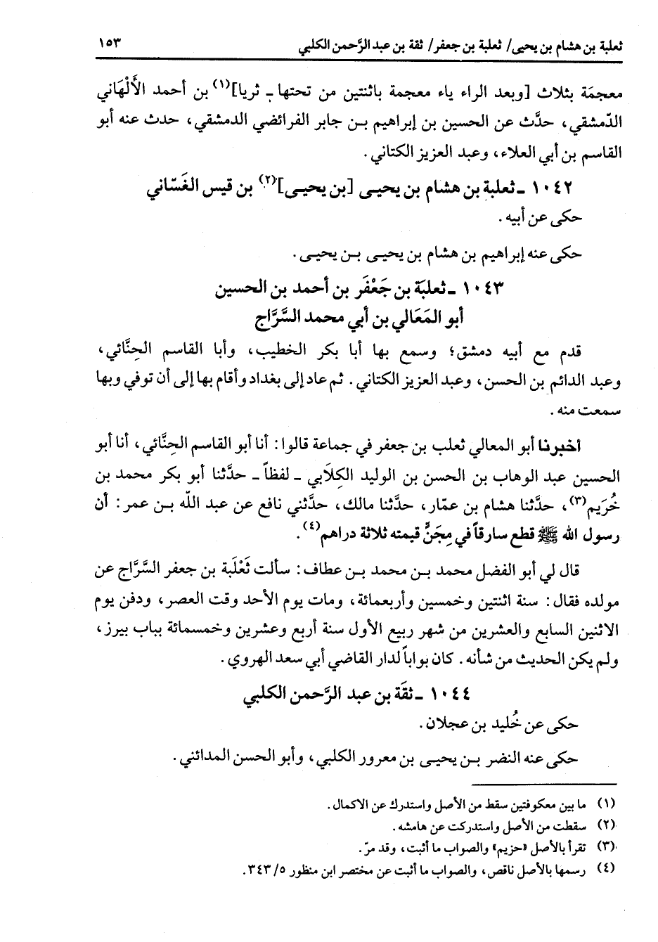 1043 - ثعلبة بن جعفر بن أحمد بن الحسين أبو المعالي بن أبي محمد السراج قدم مع أبيه دمشق وسمع بها أبا بكر الخطيب وأبا القاسم الحنائي وعبد الدائم بن الحسن وعبد العزيز الكتاني ثم عاد إلى بغداد وأقام بها إلى أن توفي وبها سمعت منه أخبرنا أبو المعالي ثعلب بن جعفر في جماعة قالوا أنا أبو القاسم الحنائي أنا أبو الحسين عبد الوهاب بن الحسن بن الوليد الكلابي لفظا حدثنا أبو بكر محمد بن خريم (3) حدثنا هشام بن عمار حدثنا مالك حدثني نافع عن عبد الله بن عمر أن رسول الله (صلى الله عليه وسلم) قطع سارقا في مجن قيمته ثلاثة دراهم (4) ح قال لي أبو الفضل محمد بن محمد بن عطاف سالت ثعلبة بن جعفر السراج عن مولده فقال سنة اثنتين وخمسين وأربعمائة ومات يوم الأحد وقت العصر ودفن يوم الأثنين السابع والعشرين من شهر ربيع الأول سنة أربع وعشرين وخمسمائة بباب بيرز ولم يكن الحديث من شأنه كان بوابا لدار القاضي أبي سعد الهروي
