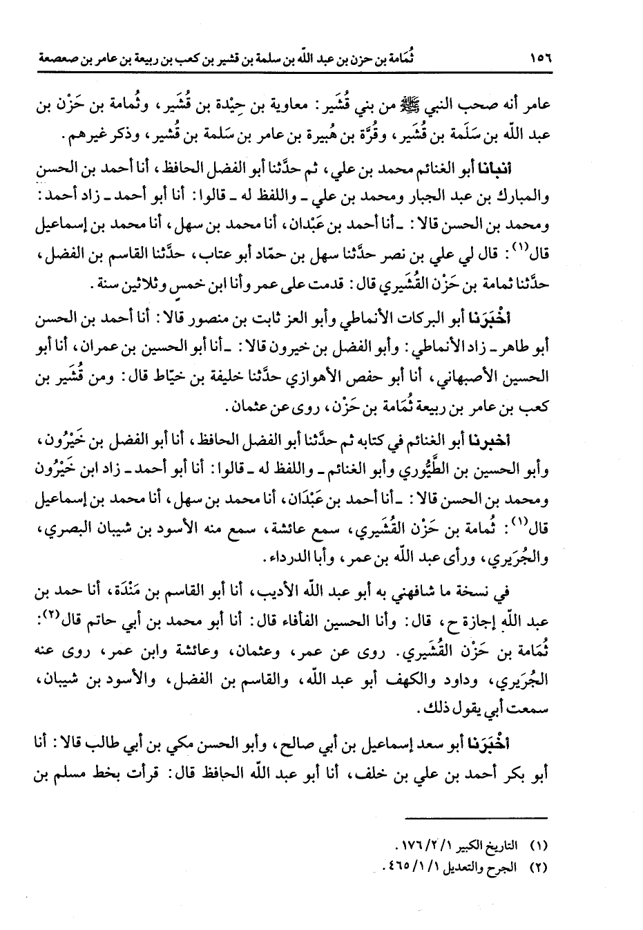 عامر أنه صحب النبي (صلى الله عليه وسلم) من بني قشير معاوية بن حيدة بن قشير وثمامة بن حزن بن عبد الله بن سلمة بن قشير وقرة بن هبيرة بن عامر بن سلمة بن قشير وذكر غيرهم أنبأنا أبو الغنائم محمد بن علي ثم حدثنا أبو الفضل الحافظ أنا أحمد بن الحسن والمبارك بن عبد الجبار ومحمد بن علي واللفظ له قالوا أنا أبو أحمد زاد أحمد ومحمد بن الحسن قالا أنا أحمد بن عبدان أنا محمد بن سهل أنا محمد بن إسماعيل قال (1) قال لي علي بن نصر حدثنا سهل بن حماد أبو عتاب حدثنا القاسم بن الفضل حدثنا ثمامة بن حزنة القيشيري قال قدمت على عمر وأنا أبن خمس وثلاثين سنة أخبرنا أبو البركات الأنماطي وأبو العز ثابت بن منصور قالا أنا أحمد بن الحسن أبو طاهر زاد الأنماطي وأبو الفضل بن خيرون قالا أنا أبو الحسين بن عمران أنا أبو الحسين الأصبهاني أنا أبو حفص الأهوازي حدثنا خليفة بن خياط قال ومن قشير بن كعب بن عامر بن ربيعة ثمامة بن حزن روى عن عثمان أخبرنا أبو الغنائم في كتابه ثم حدثنا أبو الفضل الحافظ أنا أبو الفضل بن خيرون وأبو الحسين بن الطيوري وأبو الغنائم واللفظ له قالوا أنا أبو أحمد زاد ابن خيرون ومحمد بن الحسن قالا أنا أحمد بن عبدان أنا محمد بن سهل أنا محمد بن إسماعيل قال (1) ثمامة بن حزن القشيري سمع عائشة سمع منه الأسود بن شيبان البصري والجريري ورأى عبد الله بن عمر وأبا الدرداء في نسخة ما شافهني به أبو عبد الله الأديب أنا أبو القاسم بن مندة أنا أحمد بن عبد الله إجازة ح قال وأنا الحسين الفأفاء قال أنا أبو محمد بن أبي حاتم قال (2) ثمامة بن حزن القشيري روى عن عمر وعثمان وعائشة وابن عمر روى عنه الجريري وداود والكهف أبو عبد الله والقاسم بن الفضل والأسود بن شيبان سمعت أبي يقول ذلك أخبرنا أبو سعد إسماعيل بن أبي صالح وأبو الحسن مكي بن أبي طالب قالا أنا أبو بكر أحمد بن علي بن خلف أنا أبو عبد الله الحافظ قال قرأت بخط مسلم بن