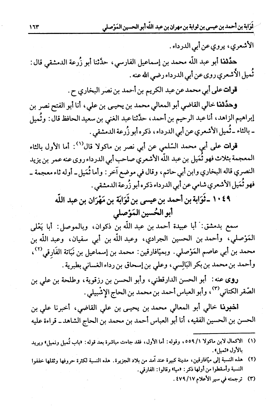 1049 - ثوابة بن أحمد بن عيسى بن ثوابة بن مهران بن عبد الله أبو الحسين الموصلي سمع بدمشق أبا عبيدة أحمد بن عبد الله بن ذكوان وبالموصل أبا يعلى الموصلي وأحمد بن الحسين الجرادي وعبد الله بن أبي سفيان وعبد الله بن محمد بن أبي عاصم الموصلي وبميافارقين محمد بن إسماعيل بن نباتة الفارقي (2) وأحمد بن محمد بن بكر البالسي وعلي بن إسحاق بن رداء الغساني بطبرية روى عنه أبو الحسن الدارقطني وأبو الحسن بن رزقوية وطلحة بن علي بن الصقر الكتاني (3) وأبو العباس أحمد بن محمد بن الحاج الإشبيلي أخبرنا خالي أبو المعالي محمد بن يحيى بن علي القاضي أخبرنا علي بن الحسن بن الحسين الفقيه أنا أبو العباس أحمد بن محمد بن الحاج الشاهد قراءة عليه
