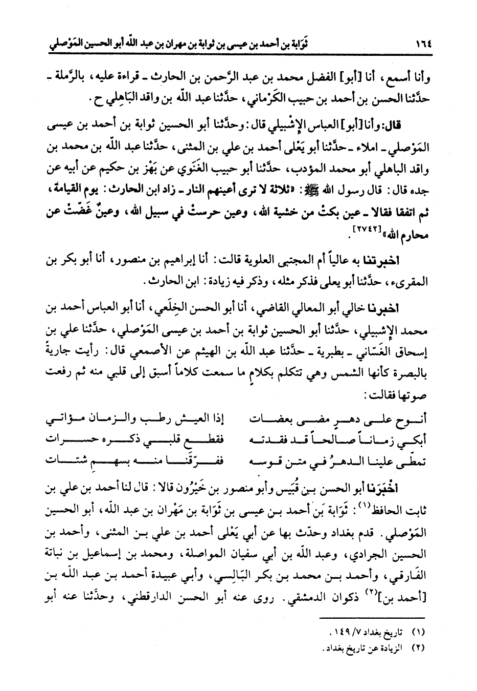[2742] ح أخبرنا به عاليا أم المجتبي العلوية قالت أنا إبراهيم بن منصور أنا أبو بكر بن المقرئ حدثنا أبو يعلى فذكر مثله وذكر فيه زيادة ابن الحارث أخبرنا خالي أبو المعالي القاضي أنا أبو الحسن الخلعي أنا أبو العباس أحمد بن محمد الإشبيلي حدثنا أبو الحسين ثوابة بن أحمد بن عيسى الموصلي حدثنا علي بن إسحاق الغساني بطبرية حدثنا عبد الله بن الهيثم عن الأصمعي قال رأيت جارية بالبصرة كأنها الشمس وهي تتكلم بكلام ما سمعت كلاما أسبق إلى قلبي منه ثم رفعت صوتها فقالت أنوح على دهر مضى بعضات * إذا العيش رطب والزمان مؤاتي أبكي زمانا صالحا قد فقدته * فقطع قلبي ذكره حسرات تمطى علينا الدهر في متن قوسه * ففرقنا منه بسهم شتات * أخبرنا أبو الحسن بن قبيس وأبو منصور بن خيرون قالا قال لنا أحمد بن علي بن ثابت الحافظ (1) ثوابة بن أحمد بن عيسى بن ثوابة بن مهران بن عبد الله أبو الحسين الموصلي قدم بغداد وحدث بها عن أبي يعلى أحمد بن علي بن المثنى وأحمد بن الحسين الجرادي وعبد الله بن أبي سفيان المواصلة ومحمد بن إسماعيل بن نباتة الفارقي وأحمد بن محمد بن بكر البالسي وأبي عبيدة أحمد بن عبد الله بن أحمد بن (222) ذكوان الدمشقي روى عنه أبو الحسن الدارقطني وحدثنا عنه أبو