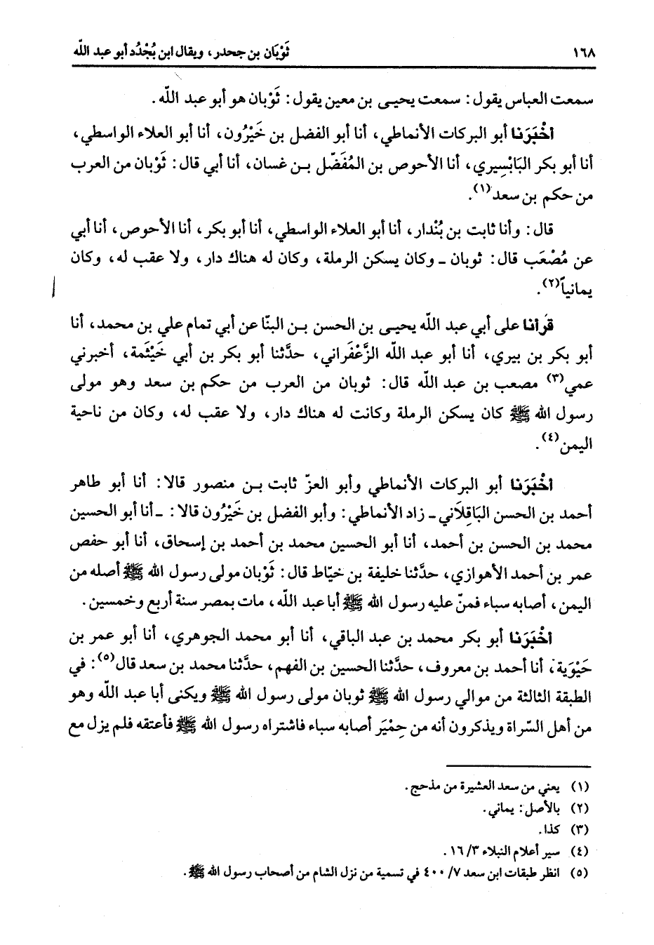 سمعت العباس يقول سمعت يحيى بن معين يقول ثوبان هو أبو عبد الله أخبرنا أبو البركات الأنماطي أنا أبو الفضل بن خيرون أنا أبو العلاء الواسطي أنا أبو بكر البابسيري أنا الأحوص بن المفضل بن غسان أنا أبي قال ثوبان من العرب من حكم بن سعد (1) قال وأنا ثابت بن بندار أنا أبو العلاء الواسطي أنا أبو بكر أنا الأحوص أنا أبي عن مصعب قال ثوبان وكان يسكن الرملة وكان له هناك دار ولا عقب له وكان يمانيا (2) قرأنا على أبي عبد الله يحيى بن الحسن بن البنا عن أبي تمام علي بن محمد أنا أبو بكر بن بيري أنا أبو عبد الله الزعفراني حدثنا أبو بكر بن أبي خيثمة أخبرني عمي (3) مصعب بن عبد الله قال ثوبان من العرب من حكم بن سعد وهو مولى رسول الله (صلى الله عليه وسلم) كان يسكن الرملة وكانت له هناك دار ولا عقب له وكان من ناحية اليمن (4) أخبرنا أبو البركات الأنماطي وأبو العز ثابت بن منصور قالا أنا أبو طاهر أحمد بن الحسن الباقلاني زاد الأنماطي وأبو الفضل بن خيرون قالا أنا أبو الحسين محمد بن الحسن بن أحمد أنا أبو الحسين محمد بن أحمد بن إسحاق أنا أبو حفص عمر بن أحمد الأهوازي حدثنا خليفة بن خياط قال ثوبان مولى رسول الله (صلى الله عليه وسلم) أصله من اليمن أصابه سباء فمن عليه رسول الله (صلى الله عليه وسلم) أبا عبد الله مات بمصر سنة أربع وخمسين أخبرنا أبو بكر محمد بن عبد الباقي أنا أبو محمد الجوهري أنا أبو عمر بن حيوية أنا أحمد بن معروف حدثنا الحسين بن الفهم حدثنا محمد بن سعد قال (5) في الطبقة الثالثة من موالي رسول الله (صلى الله عليه وسلم) ثوبان مولى رسول الله (صلى الله عليه وسلم) ويكنى أبا عبد الله وهو من أهل السراة ويذكرون انه من حمير أصابه سباء فاشتراه رسول الله (صلى الله عليه وسلم) فأعتقه فلم يزل مع