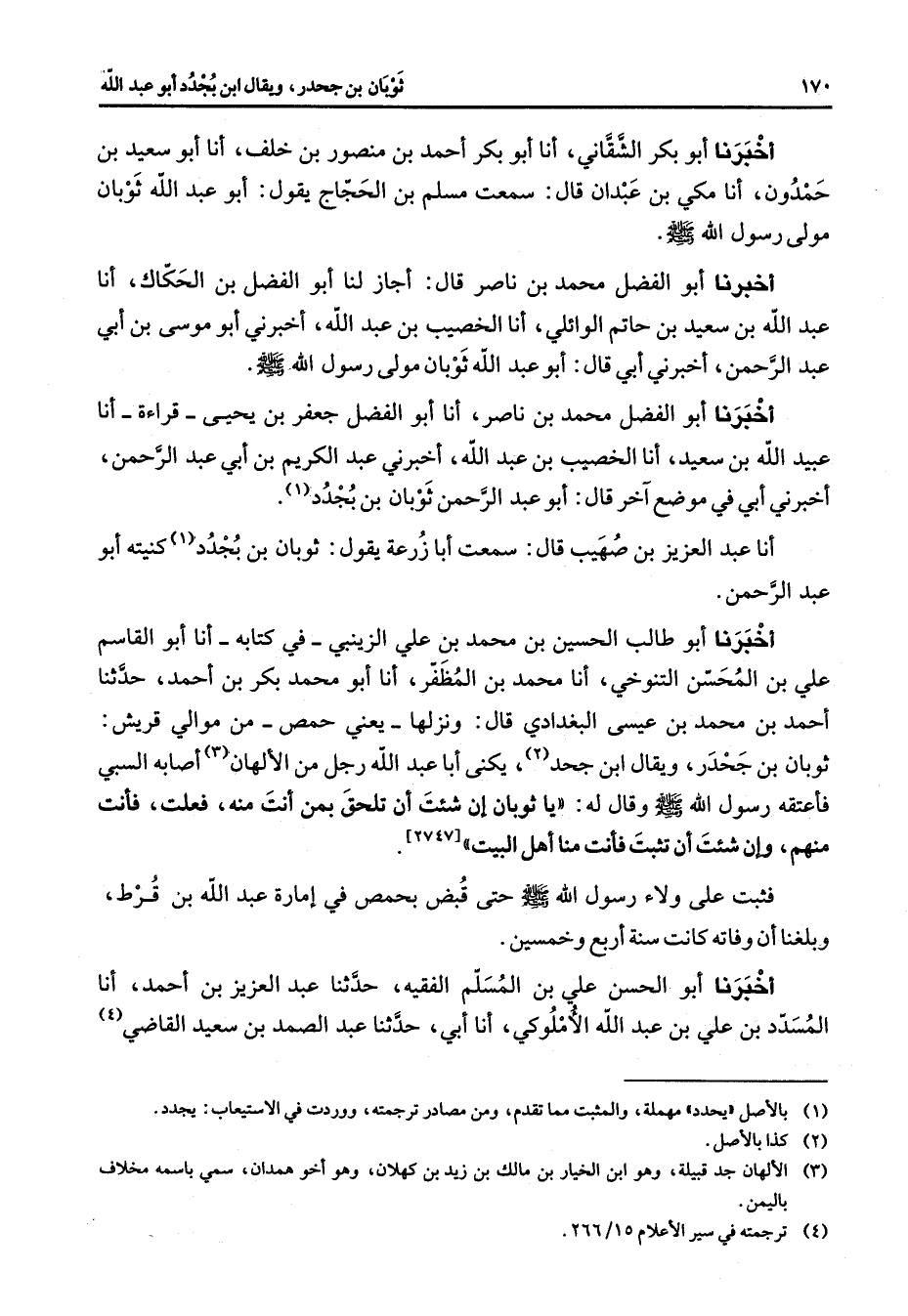 أخبرنا أبو بكر الشقاني أنا أبو بكر أحمد بن منصور بن خلف أنا أبو سعيد بن حمدون أنا مكي بن عبدان قال سمعت مسلم بن الحجاج يقول أبو عبد الله ثوبان مولى رسول الله (صلى الله عليه وسلم) أخبرنا أبو الفضل محمد بن ناصر قال أجاز لنا أبو الفضل بن الحكاك أنا عبد الله بن سعيد بن حاتم الوائلي أنا الخصيب بن عبد الله أخبرني أبو موسى بن ابي عبد الرحمن أخبرني أبي قال أبو عبد الله ثوبان مولى رسول الله (صلى الله عليه وسلم) أخبرنا أبو الفضل محمد بن ناصر أنا أبو الفضل جعفر بن يحيى قراءة أنا عبيد الله بن سعيد أنا الخصيب بن عبد الله أخبرني عبد الكريم بن أبي الرحمن أخبرني أبي في موضع آخر قال أبو عبد الرحمن ثوبان بن بجدد (1) أنا عبد العزيز بن صهيب قال سمعت أبا زرعة يقول ثوبان بن بجدد (1) كنيته أبو عبد الرحمن أخبرنا أبو طالب الحسين بن محمد بن علي الزينبي في كتابه أنا أبو القاسم علي بن المحسن التنوخي أنا محمد بن المظفر أنا أبو محمد بكر بن أحمد حدثنا أحمد بن محمد بن عيسى البغدادي قال ونزلها يعني حمص من موالي قريش ثوبان بن جحدر ويقال ابن جحد (2) يكنى أبا عبد الله رجل من الألهان (3) أصابة السبي فأعتقه رسول الله (صلى الله عليه وسلم) وقال له يا ثوبان إن شئت أتلحق بمن أنت منه فعلت فأنت منهم إن شئت وأن تثبت فأنت منا أهل البيت ح