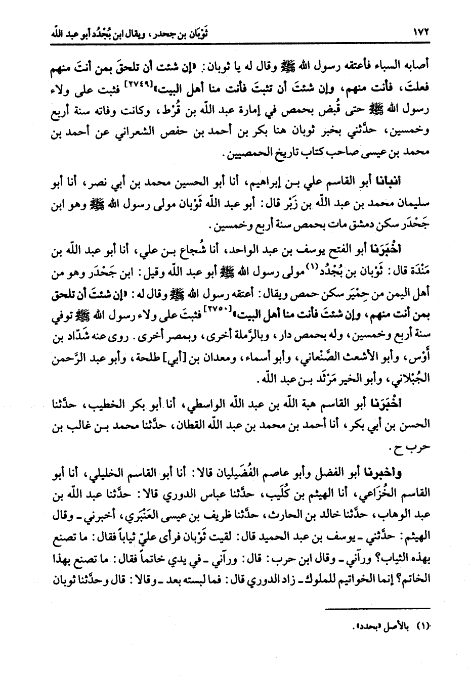 [2749] ح فثبت على ولاء رسول الله (صلى الله عليه وسلم) حتى قبض بحمص في إمارة عبد الله بن قرط وكانت وفاته سنة أربع وخمسين حدثني بخبر ثوبان هنا بكر بن أحمد بن حفص الشعراني عن أحمد بن محمد بن عيسى صاحب كتاب تاريخ الحمصيين أنبأنا أبو القاسم علي بن إبراهيم أنا أبو الحسين محمد بن أبي نصر أنا أبو سليمان محمد بن عبد الله بن زبر قال أبو عبد الله ثوبان مولى رسول الله (صلى الله عليه وسلم) وهو ابن جحدر سكن دمشق مات بحمص سنة أربع وخمسين أخبرنا أبو الفتح يوسف بن عبد الواحد أنا شجاع بن علي أنا أبو عبد الله بن مندة قال ثوبان بن بجدد (1) مولى رسول الله (صلى الله عليه وسلم) أبو عبد الله وقيل ابن جحدر وهو من أهل اليمن من حمير سكن حمص ويقال أعتقه رسول الله (صلى الله عليه وسلم) وقال له إن شئت أن تلحق بمن أنت منهم وإن شئت فأنت منا أهل البيت