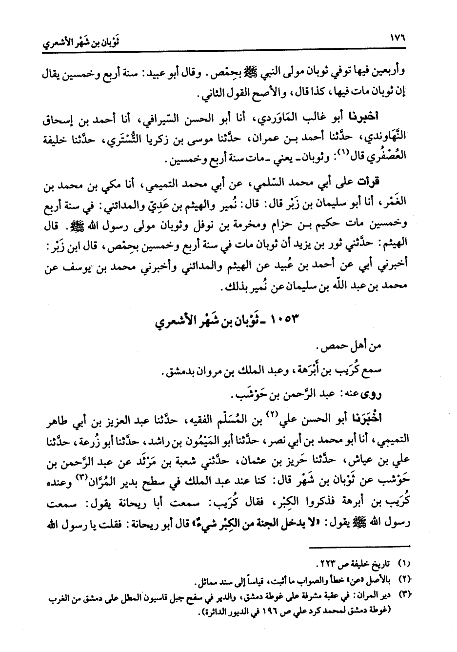 1053 - ثوبان بن شهر الأشعري من أهل حمص سمع كريب بن أبرهة وعبد الملك بن مروان بدمشق روى عنه عبد الرحمن بن حوشب أخبرنا أبو الحسن علي (2) بن المسلم الفقيه حدثنا عبد العزيز بن أبي طاهر التميمي أنا أبو محمد بن أبي نصر حدثنا أبو الميمون بن راشد حدثنا أبو زرعة حدثنا علي بن عياش حدثنا حريز بن عثمان حدثني شعبة بن مرثد عن عبد الرحمن بن حوشب عن ثوبان بن شهر قال كنا عند عبد الملك بن مروان في سطح بدير المران (3) وعنده كريب بن أبرهة فذكروا الكبر فقال كريب سمعت أبا ريحانة يقول سمعت رسول الله (صلى الله عليه وسلم) يقول لا يدخل الجنة من الكبر شيئا قال أبو ريحانة فقلت يا رسول الله