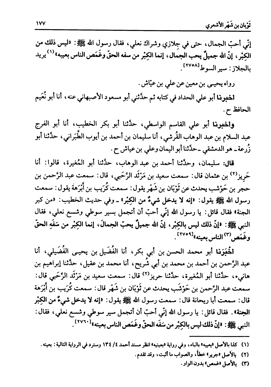 [2758] ح رواه يحيى بن معين عن علي بن عياش أخبرنا أبو علي الحداد في كتابثم حدثني أبو مسعود الأصبهاني عنه أنا أبو نعيم الحافظ ح وأخبرنا أبو القاسم الواسطي حدثنا أبو بكر الخطيب أنا أبو الفرج عبد السلام بن عبد الوهاب القرشي أنا سليمان بن أحمد بن أيوب الطبراني حدثنا أبو زرعة هو الدمشقي حدثنا أبو اليمان وعلي بن عياش ح قال سليمان وحدثنا أحمد بن عبد الوهاب حدثنا أبو المغيرة قالوا أنا حريز (2) بن عثمان قال سمعت سعيد بن مرثد الرحبي قال سمعت عبد الرحمن بن حجر بن حوشب يحدث عن ثوبان بن شهر يقول سمعت كريب بن أبرهة يقول سمعت رسول الله (صلى الله عليه وسلم) يقول إنه لا يدخل شئ من الكبر وفي حديث الخطيب من كبر الجنة فقال قائل يا رسول الله إني أحب أن أتجمل بسير سوطي وشسع نعلي فقال النبي (صلى الله عليه وسلم) إن ذلك ليس بالكبر إن الله جميل يحب الجمال إنما الكبر من سفه الحق وغمص (3) الناس بعينه