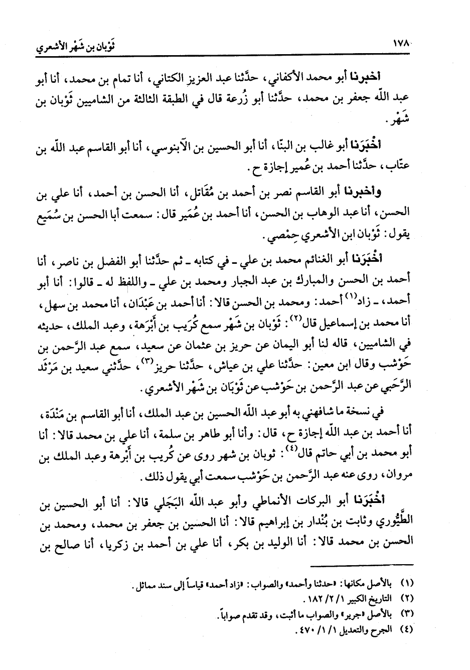 أخبرنا أبو محمد الأكفاني حدثنا عبد العزيز الكتاني أنا تمام بن محمد أنا أبو عبد الله جعفر بن محمد حدثنا أبو زرعة قال في الطبقة الثالثة من الشاميين ثوبان بن شهر أخبرنا أبو غالب بن البنا أنا أبو الحسين بن الأبنوسي أنا أبو القاسم عبد الله بن عتاب حدثنا أحمد بن عمير إجازة ح وأخبرنا أبو القاسم نصر بن أحمد بن مقاتل أنا الحسن بن أحمد أنا علي بن الحسن أنا عبد الوهاب بن الحسن أنا أحمد بن عمير قال سمعت أبا الحسن بن سميع يقول ثوبان ابن الأشعري حمصي أخبرنا أبو الغنائم محمد بن علي في كتابه ثم حدثنا أبو الفضل بن ناصر أنا أحمد بن الحسن والمبارك بن عبد الجبار ومحمد بن علي واللفظ له قالوا أنا أبو أحمد زاد (2) أحمد ومحمد بن الحسن قالا أنا أحمد بن عبدان أنا محمد بن سهل أنا محمد بن إسماعيل قال (2) ثوبان بن شهر سمع كريببن أبرهة وعبد الملك حديثه في الشاميين قاله لنا أبو اليمان عن حريز بن عثمان عن سعيد سمع عبد الرحمن بن حوشب وقال ابن معين حدثنا علي بن عياش حدثنا حريژ (3) حدثني سعيد بن مرثد الرحبي عن عبد الرحمن بن حوشب عن ثوبان بن شهر الأشعري في نسخة ما شافهني به أبو عبد الله الحسين بن عبد الملك أنا أبو القاسم بن مندة أنا أحمد بن عبد الله إجازة ح قال وأنا أبو طاهر بن سلمة أنا علي بن محمد قالا أنا أبو محمد بن أبي حاتم قال (4) ثوبان بن شهر روى عن كريب بن أبرهة وعبد الملك بن مروان روى عنه عبد الرحمن بن حوشب سمعت أبي يقول ذلك أخبرنا أبو البركات الأنامطي وأبو عبد الله البجلي قالا أنا أبو الحسين بن الطيوري وثابت بن بندار بن إبراهيم قالا أنا الحسين بن جعفر بن محمد ومحمد بن الحسن بن محمد قالا أنا الوليد بن بكر أنا علي بن أحمد بن زكريا أنا صالح بن