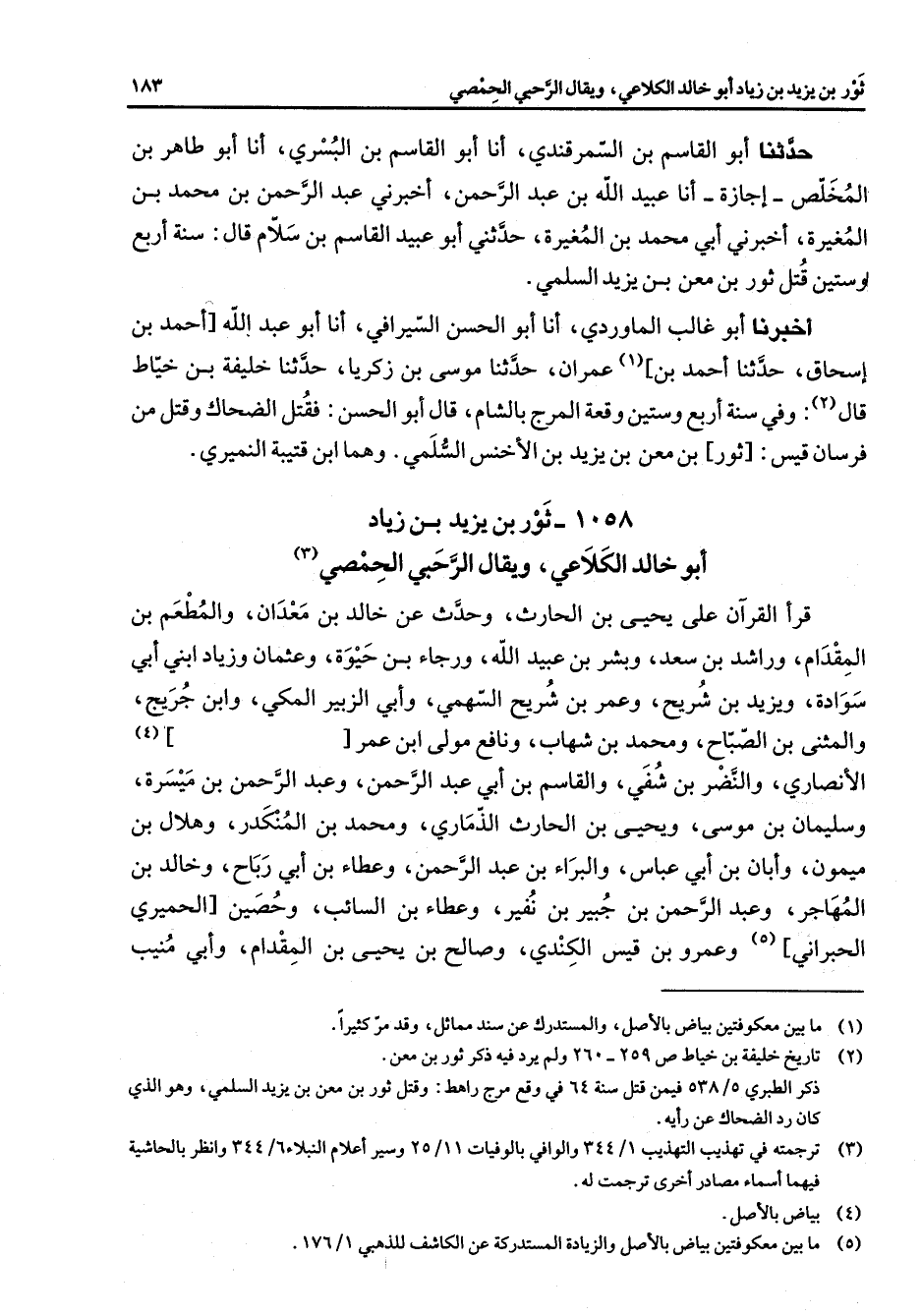1058 - ثور بن يزيد بن زياد أبو خالد الكلاعي ويقال الرحبي الحمصي (3) قرأ القرآن علي يحيى بن الحارث وحدث عن خالد بن معدان والمطعم بن المقدام وراشد بن سعد وبشر بن عبيد الله ورجاء بن حيوة وعثمان وزياد ابني أبي سوادة ويزيد بن شريح وعمر بن شريح السهمي وأبي الزبير المكي وابن جريج والمثنى بن الصباح ومحمد بن شهاب ونافع مولى ابن عمر (4) الأنصاري والنضر بن شفي والقاسم بن أبي عبد الرحمن وعبد الرحمن بن ميسرة وسليمان بن موسى ويحيى بن الحارث الذماري ومحمد بن المنكدر وهلال بن ميمون وأبان بن علي بن أبي عباس والبراء بن عبد الرحمن وعطاء بن أبي رباح وخالد بن المهاجر وعبد الرحمن بن جبير بن نفير وعطاء بن السائب وحصين الحميري الحبراني (5) وعمرو بن قيس الكندي وصالح بن يحي بن المقدام وأبي منيب