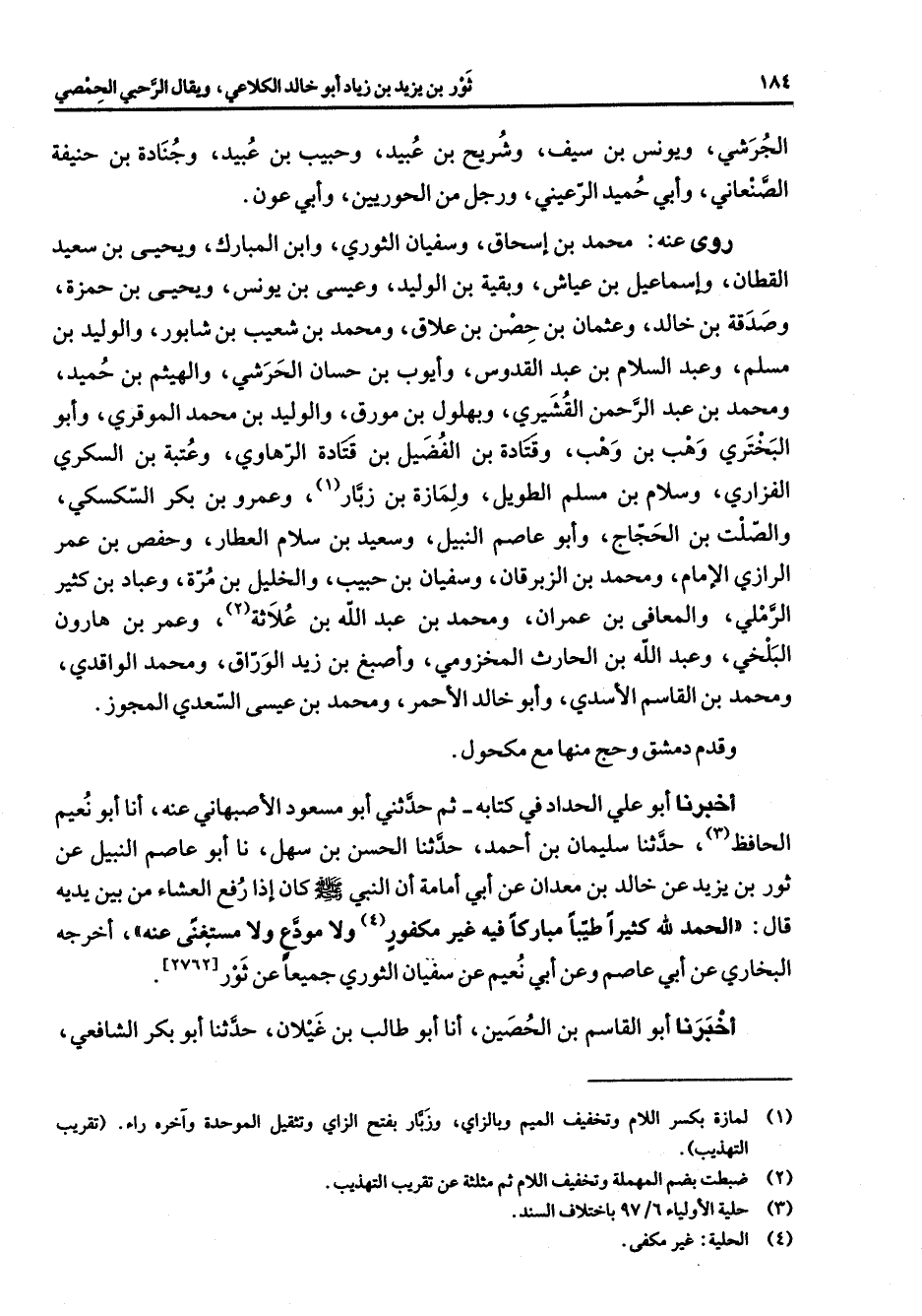 الجرشي ويونس بن سيف وشريح بن عبيد وحبيب بن عبيد وجنادة بن حنيفة الصنعاني وأبي حميد الرعيني ورجل من الحوريين وابي عون روى عنه محمد بن إسحاق وسفيان الثوري وابن المبارك ويحيى بن سعيد القطان وإسماعيل بن عياش وبقية بن الوليد وعيسى بن يونس ويحيى بن حمزة وصدقة بن خالد وعثمان بن حصن بن علاق ومحمد بن شعيب بن شابور والوليد بن مسلم وعبد السلام بن عبد القدوس وأيوب بن حسان الحرشي والهيثم بن حميد ومحمد بن عبد الرحمن القشيري وبهلول بن مورق والوليد بن محمد الموقري وأبو البختري وهب بن وهب وقتادة بن الفضيل بن قتادة الرهاوي وعتبة بن السكري الفزاري وسلام بن مسلم الطويل ولمازة بن زبار (1) وعمرو بن بكر السكسكي والصلت بن الحجاج وأبو عاصم النبيل وسعيد بن سلام العطار وحفص بن عمر الرازي الإمام ومحمد بن الزبرقان وسفيان بن حبيب والخليل بن مرة وعباد بن كثير الرملي والمعافى بن عمران ومحمد بن عبد الله بن علاثة (2) وعمر بن هارون البلخي وعبد الله بن الحارث المخزومي وأصبغ بن زيد الوراق ومحمد الواقدي ومحمد بن القاسم الأسدي وأبو خالد الأحمر ومحمد بن عيسى السعدي المجوز وقدم دمشق وحج منها مع مكحول أخبرنا أبو علي الحداد في كتابه ثم حدثني أبو مسعود الأصبهاني عنه أنا أبو نعيم الحافظ (3) حدثنا سليمان بن أحمد حدثنا الحسن بن سهل نا أبو عاصم النبيل عن ثور بن يزيد عن خالد بن معدان عن أبي أمامة أن النبي (صلى الله عليه وسلم) كان إذا رفع العشاء من بين يديه قال الحمد لله كثيرا طيبا مباركافيه غير مكفور (4) ومودع ولا مستغنى عنه أخرجه البخاري عن أبي عاصم وعن أبي نعيم عن سفيان الثوري جميعا عن ثور