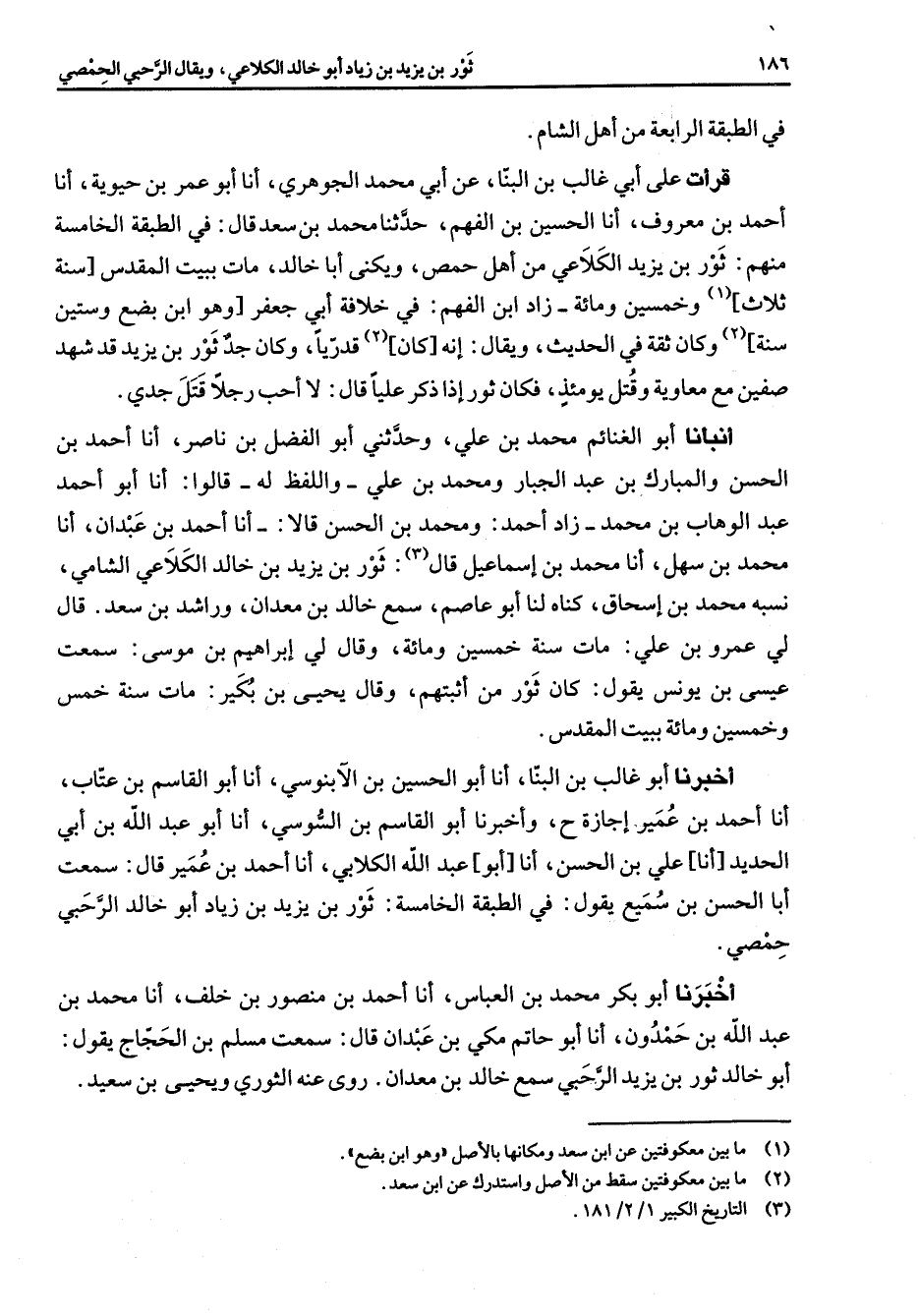 في الطبقة الرابعة من أهل الشام قرأت على أبي غالب بن البنا عن ابي محمد الجوهري أنا أبو عمر بن حيوية أنا أحمد بن معروف أنا الحسين بن الفهم حدثنا محمد بن سعد قال في الطبقة الخامسة منهم ثور بن يزيد الكلاعي من أهل حمص ويكنى أبا خالد مات ببيت المقدس سنة ثلاث (1) وخمسين ومائة زاد ابن الفهم في خلافة أبي جعفر وهو ابن بضع وستين سنة (2) وكان ثقة في الحديث ويقال إنه كان قدريا وكان جد ثور بن يزيد قد شهد صفين مع معاوية وقتل يومئذ فكان ثور إذا ذكر عليا قال لا أحب رجلا قتل جدي أنبأنا أبو الغنائم محمد بن علي وحدثني أبو الفضل بن ناصر أنا احمد بن الحسن والمبارك بن عبد الجبار ومحمد بن علي واللفظ له قالوا أنا أبو أحمد عبد الوهاب بن محمد بن زاد أحمد ومحمد بن الحسن قالا أنا أحمد بن عبدان أنا محمد بن سهل أنا محمد بن إسماعيل قال (3) ثور بن يزيد بن خالد الكلاعي الشامي نسبة محمد بن إسحاق كناه لنا أبو عاصم سمع خالد بن معدان وراشد بن سعد قال لي عمرو بن علي مات سنة خمسين ومائة وقال لي إبراهيم بن موسى سمعت عيسى بن يونس يقول كان ثور من أثبتهم وقال يحيى بن بكير مات سنة خمس وخمسين ومائة ببيت المقدس أخبرنا أبو غالب بن البنا أنا أبو الحسن بن الآبنوسي أنا أبو القاسم بن عتاب أنا أحمد بن عمير أجازة ح وأخبرنا أبو القاسم بن السوسي أنا عبد الله بن أبي الحديد أنا علي بن الحسن أنا أبو عبد الله الكلابي أنا أحمد بن عمير قال سمعت أبا الحسن بن سميع يقول في الطبقة الخامسة ثور بن يزيد بن زياد أبو خالد الرحبي حمصي أخبرنا أبو بكر محمد بن العباس أنا احمد بن منصور بن خلف أنا محمد بن عبد الله بن حمدون أنا أبو حاتم مكي بن عبدان قال سمعت مسلم بن الحجاج يقول أبو خالد ثور بن يزيد الرحبي سمع خالد بن معدان روى عنه الثوري ويحيى بن سعيد