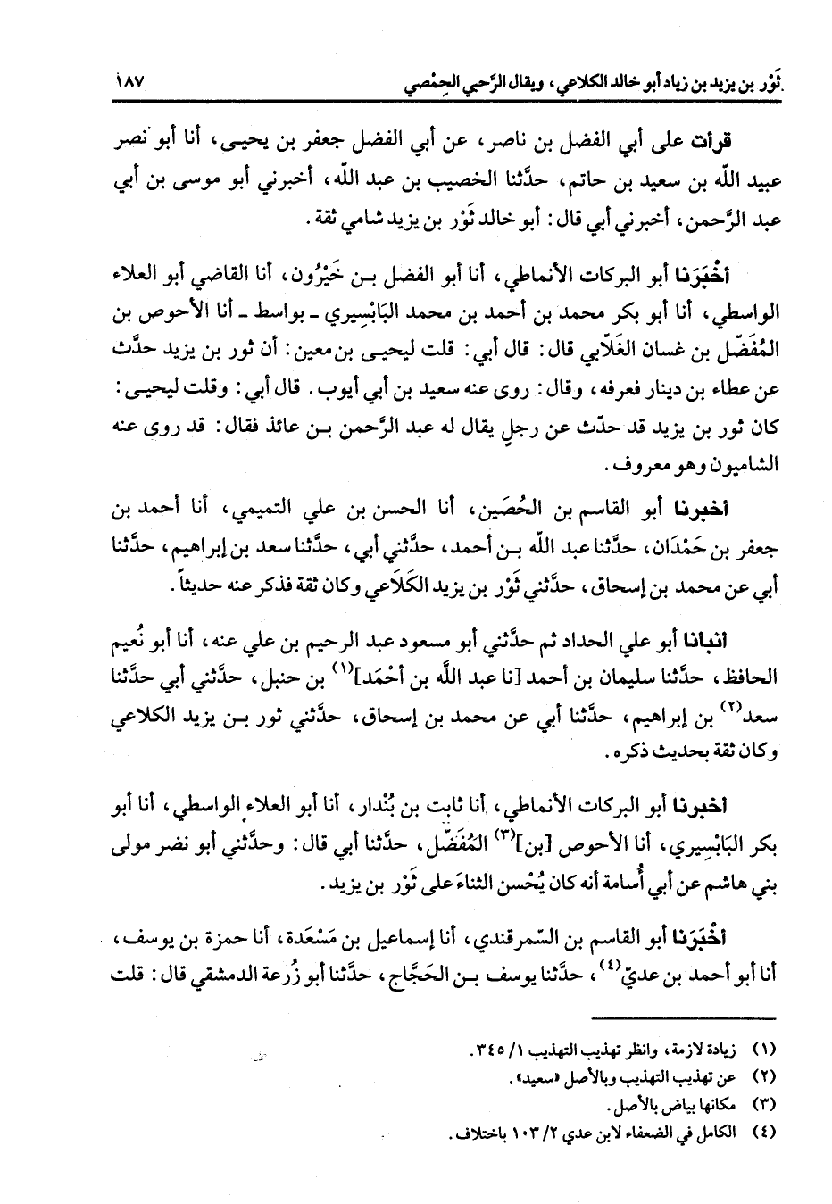 قرأت على أبي الفضل بن ناصر عن أبي الفضل جعفر بن يحيى أنا أبو نصر عبيد الله بن سعيد بن حاتم حدثنا الخصيب بن عبد الله أخبرني أبو موسى بن أبي عبد الرحمن أخبرني أبي قال أبو خالد ثور بن يزيد شامي ثقة أخبرنا أبو البركات الانماطي أنا أبو الفضل بن خيرون أنا القاضي أبو العلاء الواسطي أنا أبو بكر محمد بن أحمد بن محمد البابسيري بواسط أنا الأحوص بن المفضل بن غسان الغلابي قال قال أبي قلت ليحيى بن معين أن ثور بن يزيد حدث عن عطاء بن دينار فعرفه وقال روى عنه سعيد بن أبي أيوب قال أبي وقلت ليحيى كان ثور بن يزيد قد حدث عن رجل يقال له عبد الرحمن بن عائذ فقال قد روى عنه الشاميون وهو معروف أخبرنا أبو القاسم بن الحصين أنا الحسن بن علي التميمي أنا أحمد بن جعفر بن حمدان حدثنا عبد الله بن أحمد حدثني أبي حدثنا سعد بن إبراهيم حدثنا أبي عن محمد بن إسحاق حدثني ثور بن يزيد الكلاعي وكان ثقة فذكر عنه حديثا أنبأنا أبو علي الحداد ثم حدثني أبو مسعود عبد الرحيم بن علي عنه أنا أبو نعيم الحافظ حدثنا سليمان بن أحمد نا عبد الله بن أحمد (1) بن حنبل حدثني أبي حدثنا سعد (2) بن إبراهيم حدثنا أبي عن محمد بن إسحاق حدثني ثور بن يزيد الكلاعي وكان ثقة بحديث ذكره أخبرنا أبو البركات الأنماطي أنا ثابت بن بندار أنا أبو العلاء الواسطي أنا أبو بكر البابسيري أنا الأحوص بن (3) المفضل حدثنا أبي قال وحدثني أبو نضر مولى بني هاشم عن أبي أسامة أنه كان يحسن الثناء على ثور بن يزيد أخبرنا أبو القاسم بن السمرقندي أنا إسماعيل بن مسعدة أنا حمزة بن يوسف أنا أبو أحمد بن عدي (4) حدثنا يوسف بن الحجاج حدثنا أبو زرعة الدمشقي قال قلت