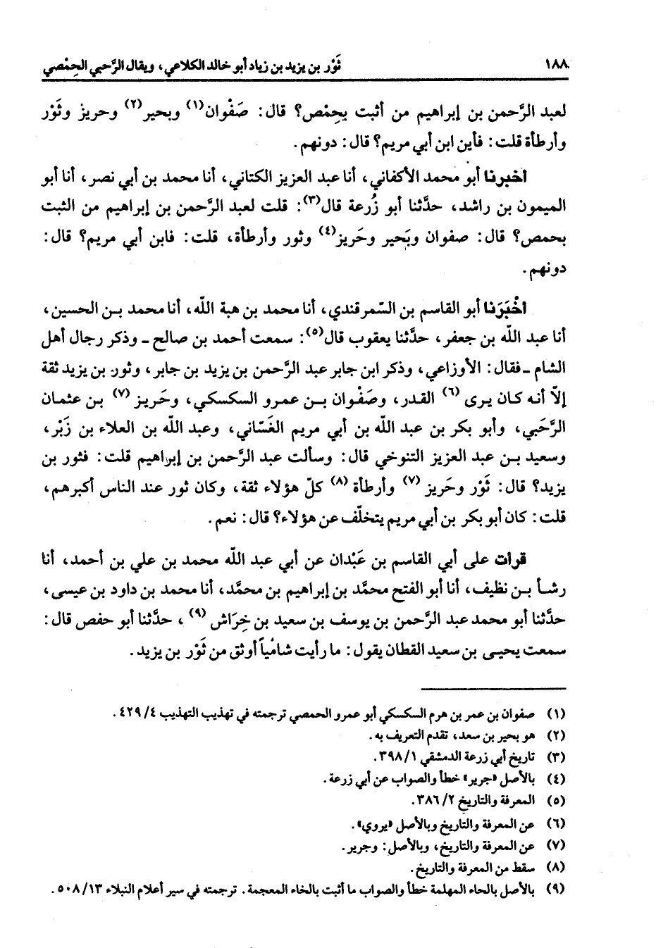 لعبد الرحمن بن إبراهيم من أثبت بحمص قال صفوان (1) وبحير (2) وحريز وثور وأرطأة قلت فأين ابن أبي مريم قال دونهم أخبرنا أبو محمد الأكفاني أنا عبد العزيز الكتاني أنا محمد بن أبي نصر أنا أبو الميمون بن راشد حدثنا أبو زرعة قال (3) قلت لعبد الرحمن بن إبراهيم من الثبت بحمص قال صفوان وبحير وحريز (4) وثور وأرطأة قلت فابن أبي مريم قال دونهم أخبرنا أبو القاسم بن السمرقندي أنا محمد بن هبة الله أنا محمد بن الحسين أنا عبد الله بن جعفر حدثنا يعقوب قال (5) سمعت أحمد بن صالح وذكر رجال أهل الشام فقال الأوزاعي وذكر ابن جابر عبد الرحمن بن يزيد بن جابر وثور بن يزيد ثقة إلا أنه كان يرى (6) القدر وصفوان بن عمرو السكسكي وحريز (6) بن عثمان الرحبي وأبو بكر بن عبد الله بن أبي مريم الغساني وعبد الله بن العلاء بن زبر وسعيد بن عبد العزيز التنوخي قال وسألت عبد الرحمن بن إبراهيم قلت فثور بن يزيد قال ثور وحريز (7) وأرطأة (8) كل هؤلاء ثقة وكان ثور عند الناس أكبرهم قلت كان أبو بكر بن أبي مريم يتخلف عن هؤلاء قال نعم قرأت على أبي القاسم بن عبدان عن أبي عبد الله محمد بن علي بن أحمد أنا رشأ بن نظيف أنا أبو الفتح محمد بن إبراهيم بن محمد أنا محمد بن داود بن عيسى حدثنا أبو محمد عبد الرحمن بن يوسف بن سعيد بن خراش (9) حدثنا أبو حفص قال سمعت يحيى بن سعيد القطان يقول ما رأيت شاميا أوثق من ثور بن يزيد