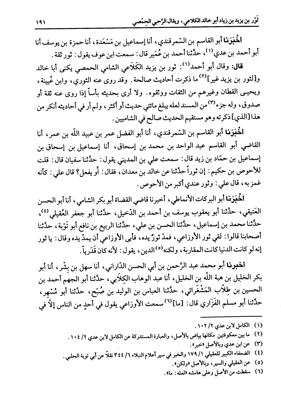 أخبرنا أبو القاسم بن السمرقندي أنا إسماعيل بن مسعدة أنا حمزة بن يوسف أنا أبو أحمد بن عدي (1) حدثنا أحمد بن عمير قال سمعت ابن عوف يقول ثور ثقة قال وقال أبو أحمد (1) ثور بن يزيد الكلاعي الشامي الحمصي يكنى أبا خالد ولثور بن يزيد غير (2) ما ذكرت أحاديث صالحة وقد روى عنه الثوري وابن عيينة ويحيى القطان وغيرهم من الثقات ووثقوه ولا أرى بحديثه بأسا إذا روى عنه ثقة أو صدوق وله جزء (3) من المسند لعله يبلغ مائتي حديث أو أكثر ولم أر في أحاديثه انكر من هذا الذي ذكرته وهو مستقيم الحديث صالح في الشاميين أخبرنا أبو القاسم بن السمرقندي أنا أبو الفضل عمر بن عبيد الله بن عمر أنا القاضي أبو القاسم عبد الواحد بن محمد بن إسحاق أنا إسماعيل بن إسحاق بن إسماعيل بن حماد بن زيد قال سمعت علي بن المديني يقول حدثنا سفيان قال قلت للأحوص بن حكيم إن ثورا حدثنا عن خالد بن معدان فقال أو يفعل قال علي كأنه غمز به قال علي وثور عندي أكبر من الأحوص أخبرنا أبو البركات الأنماطي أخبرنا قاضي القضاة أبو بكر الشامي أنا أبو الحسن العتيقي حدثنا أبو يعقوب يوسف بن أحمد بن الدخيل حدثنا أبو جعفر العقيلي (4) حدثنا محمد بن إسماعيل حدثنا الحسن بن علي حدثنا الربيع بن نافع أبو توبة حدثنا أصحابنا قالوا لقي ثور الأوزاعي فمد ثور يده فأبى الأوزاعي أن يمد يده وقال يا ثور إنه لو كانت الدنيا كانت المقاربة ولكنه (5) الدين يقول لأنه كان قدريا أخبرنا أبو محمد عبد الرحمن بن أبي الحسن الداراني أنا سهل بن بشر أنا أبو بكر الخليل بن هبة الله بن الخليل أنا عبد الوهاب الكلابي حدثنا أبو الجهم أحمد بن الحسين بن طلاب المشغرائي حدثنا العباس بن الوليد بن صبح حدثنا أبو مسهر حدثنا أبو مسلم الفزاري قال ما (6) سمعت الأوزاعي يقول في أحد من الناس إلا في